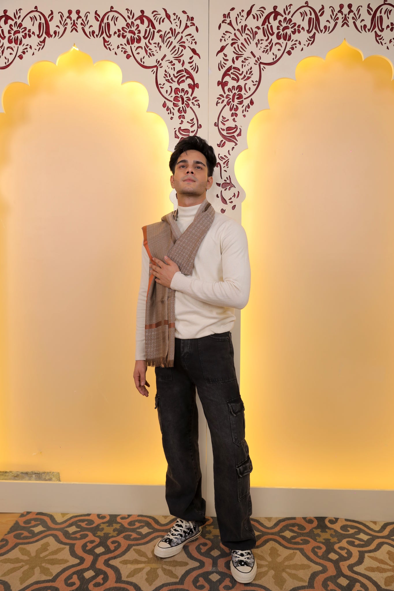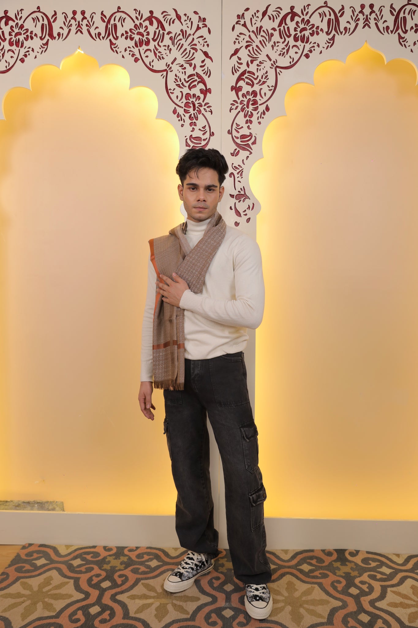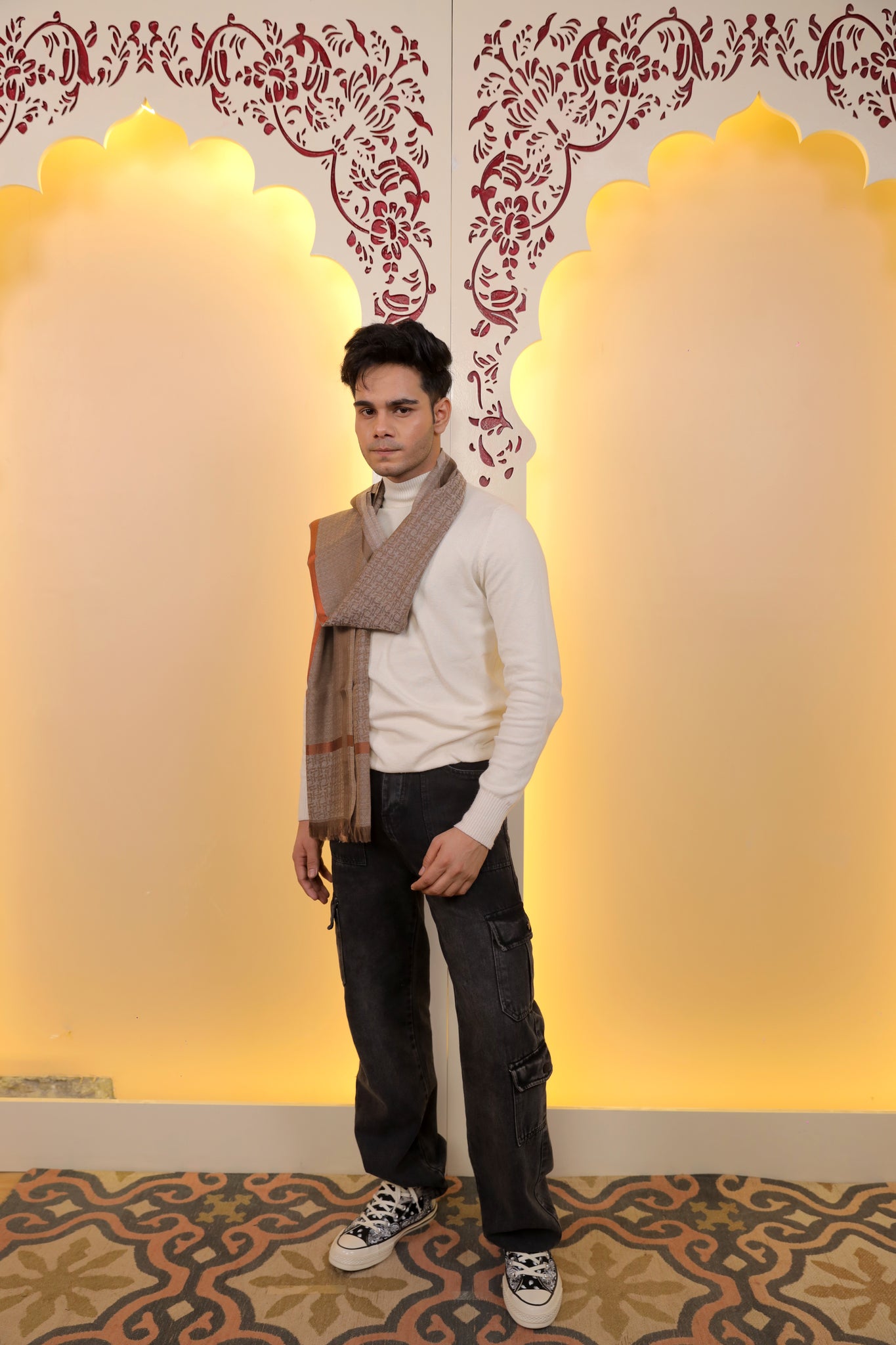 A cozy jacquard scarf in earthy beige and taupe with copper borders and bold maroon-orange stripes—perfect for autumn elegance.