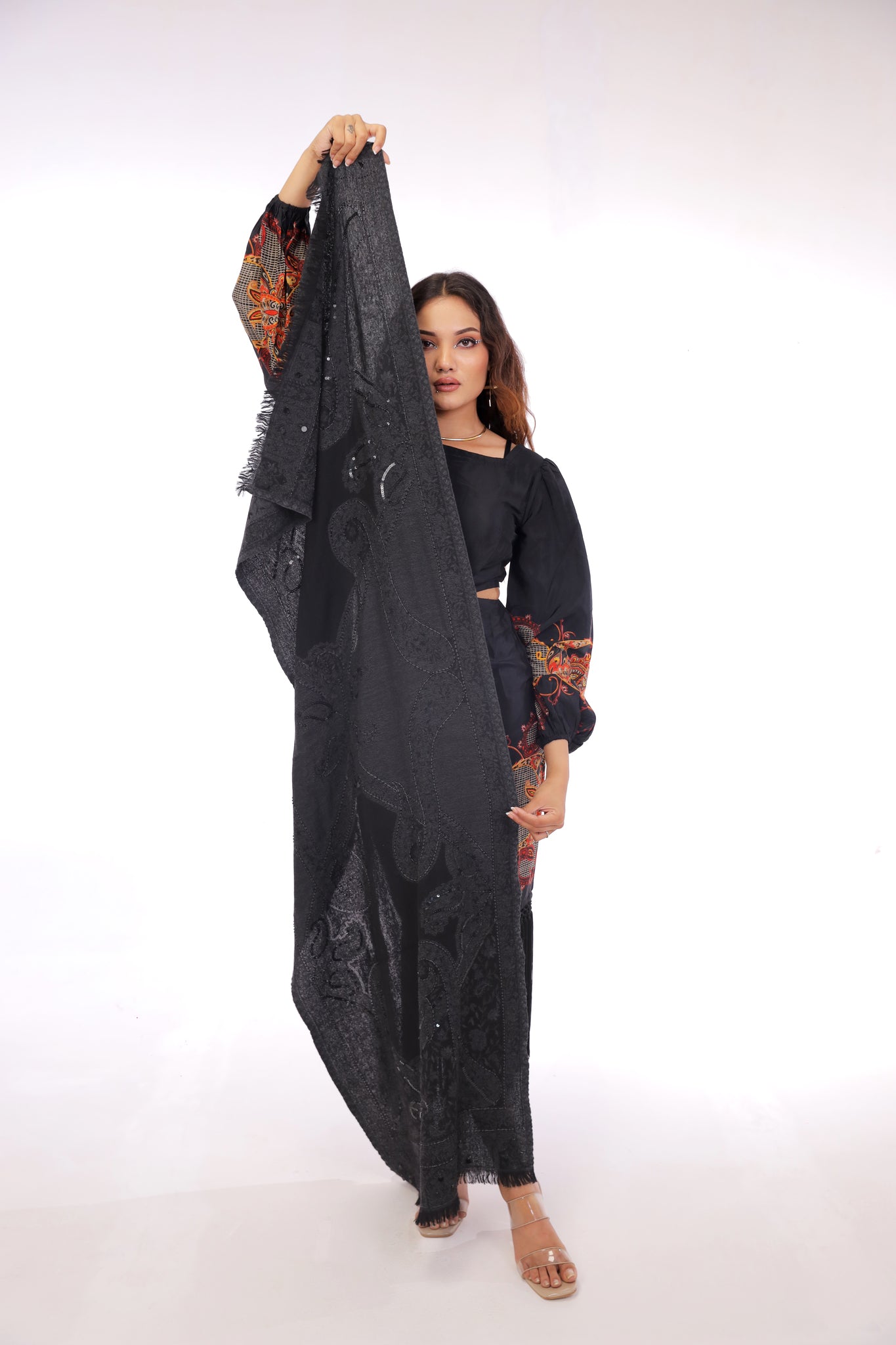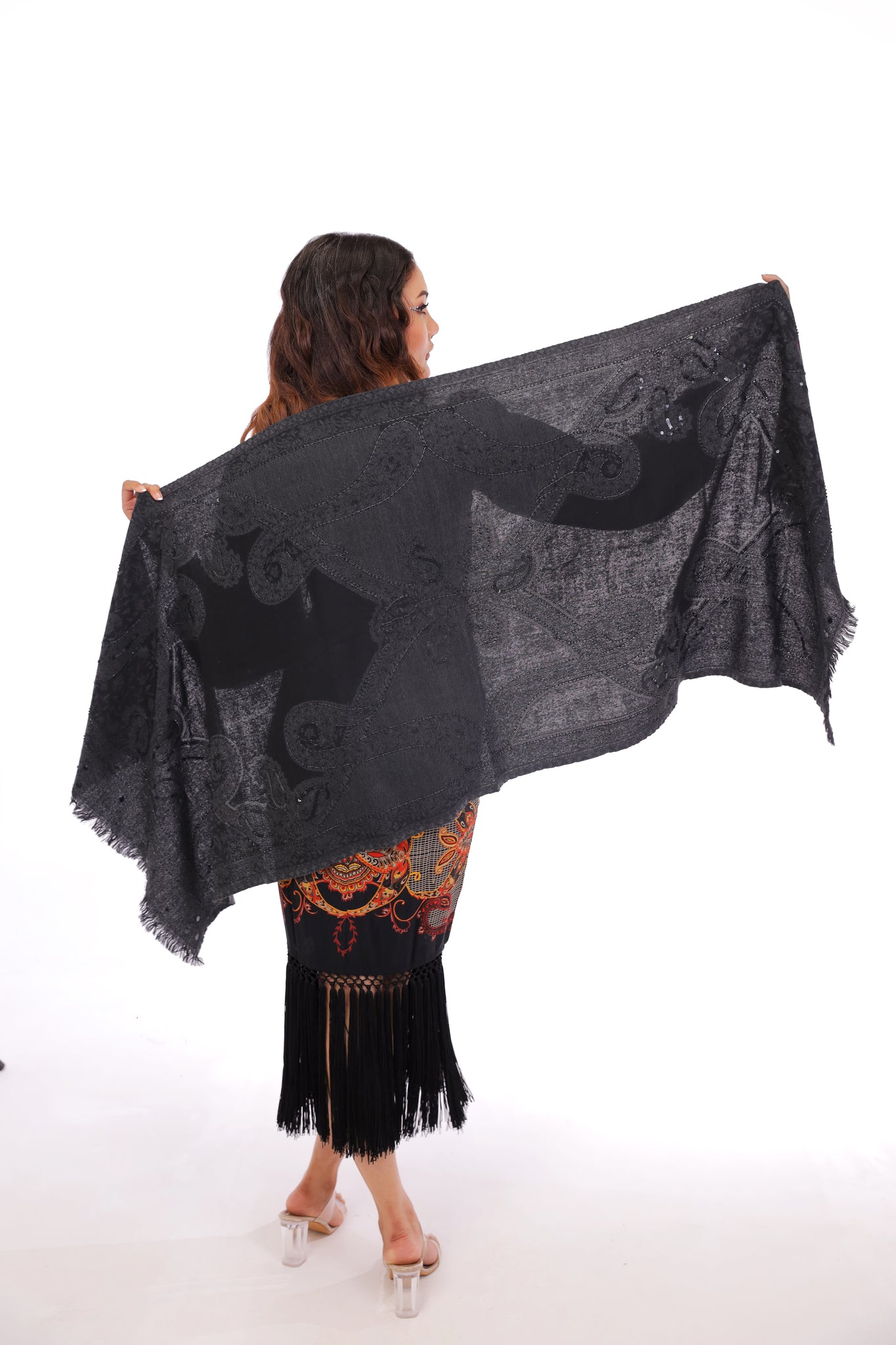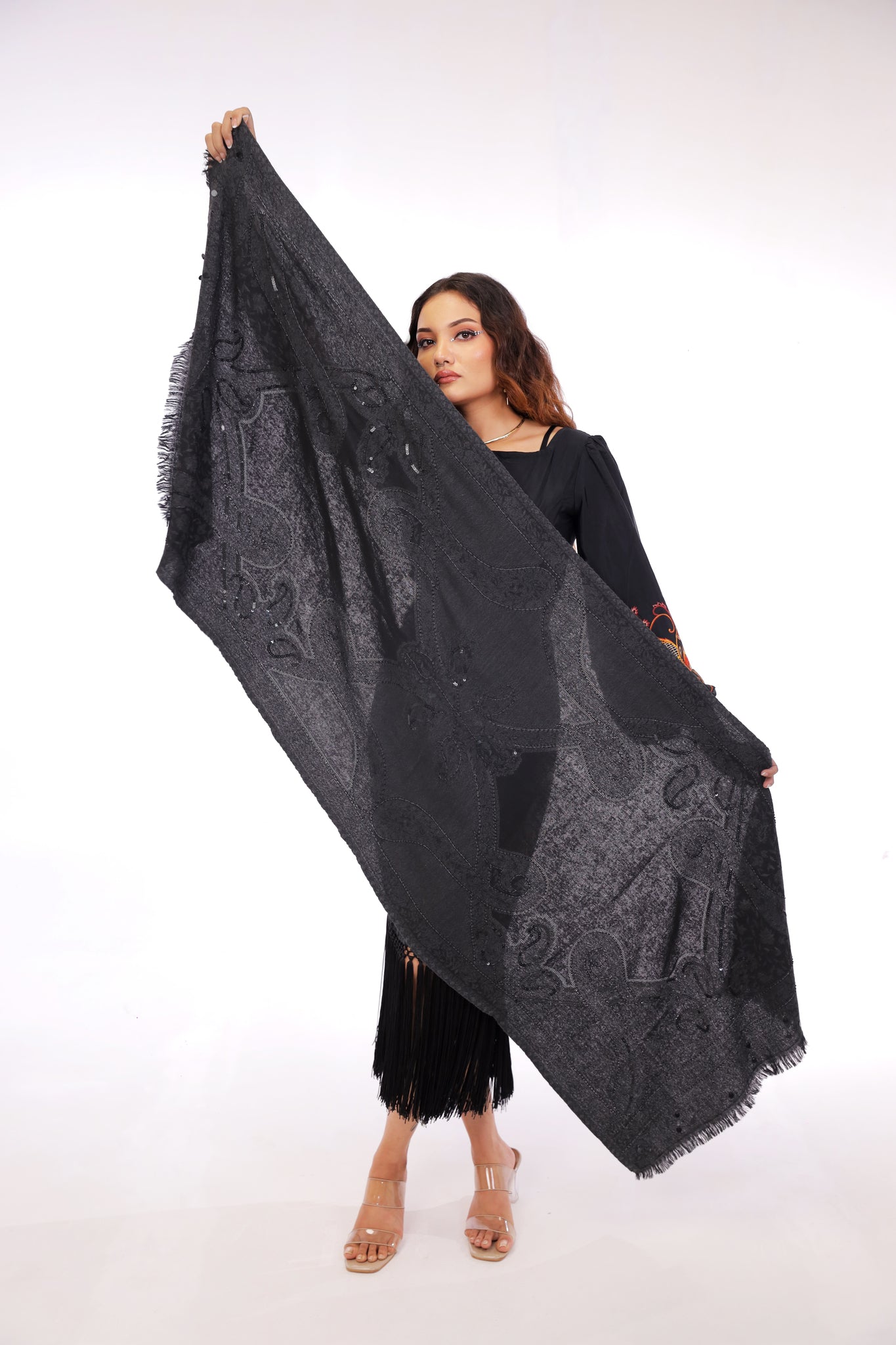 A timeless black wool shawl adorned with shimmering hand embroidery—Night Echo brings together Kashmiri artistry and graceful elegance for your most refined moments.