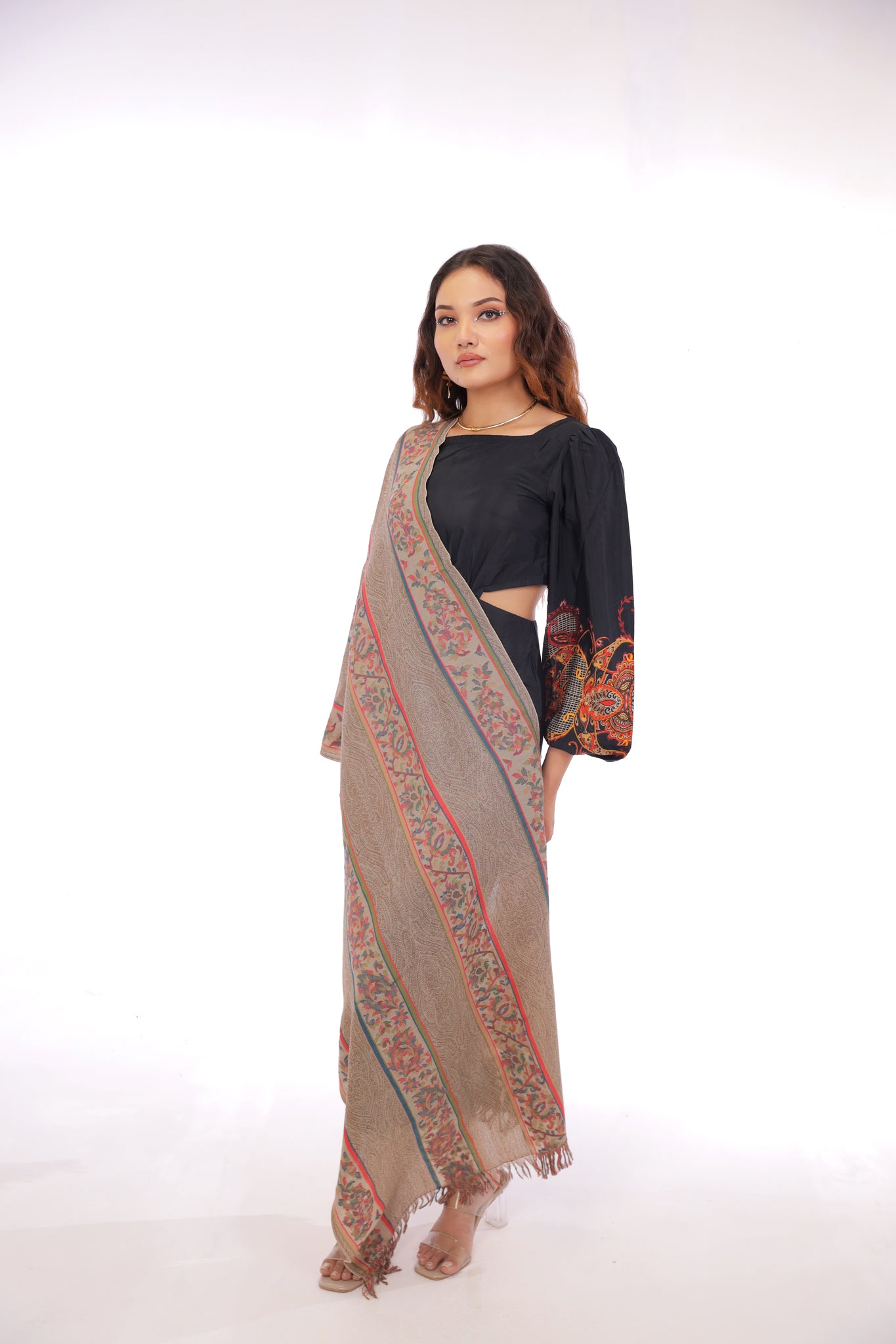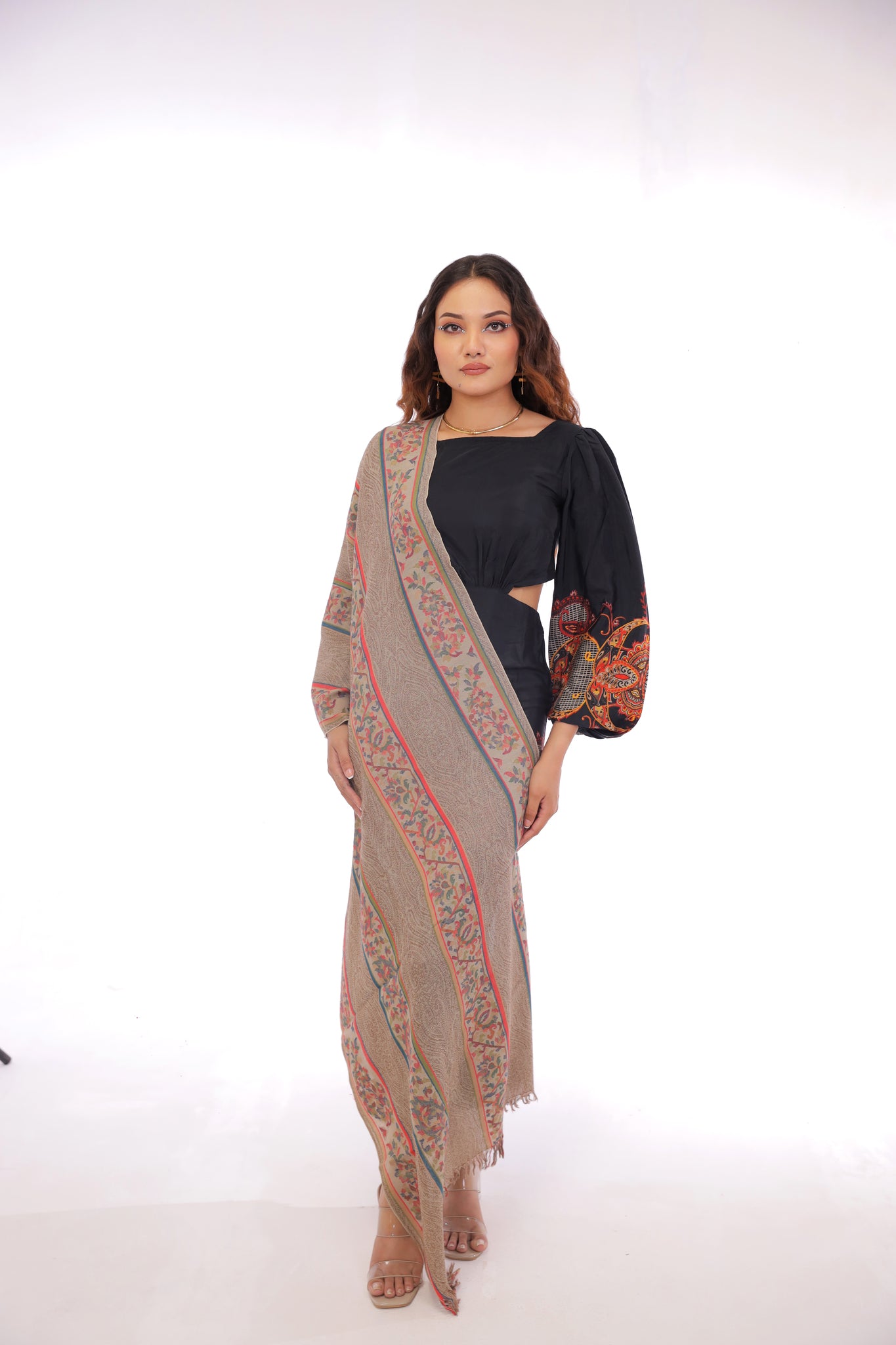 A handwoven Kani Pashmina shawl with earthy-toned stripes, blending traditional craftsmanship with contemporary elegance.