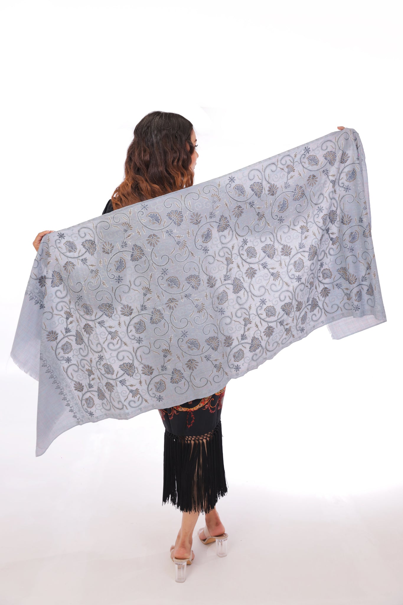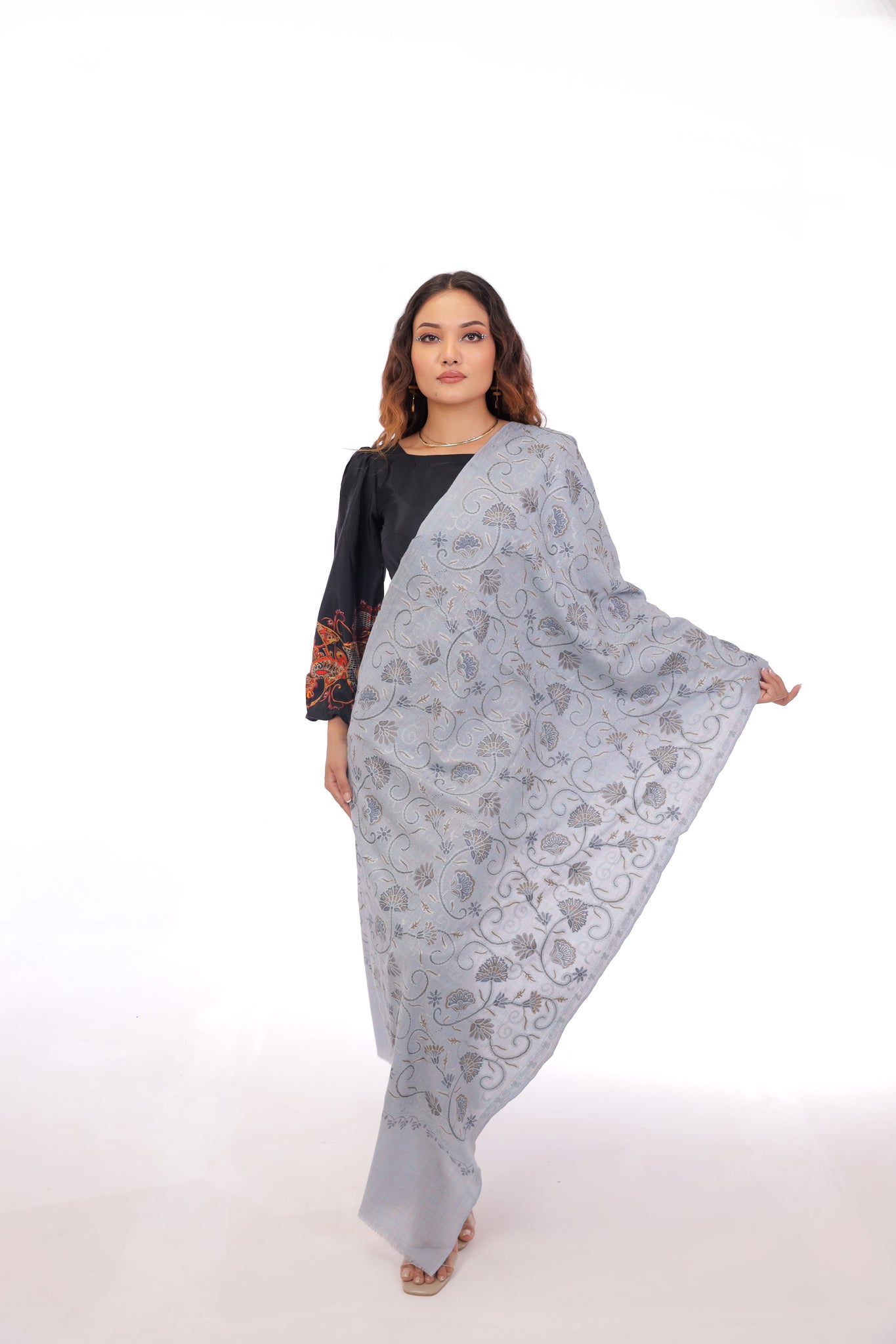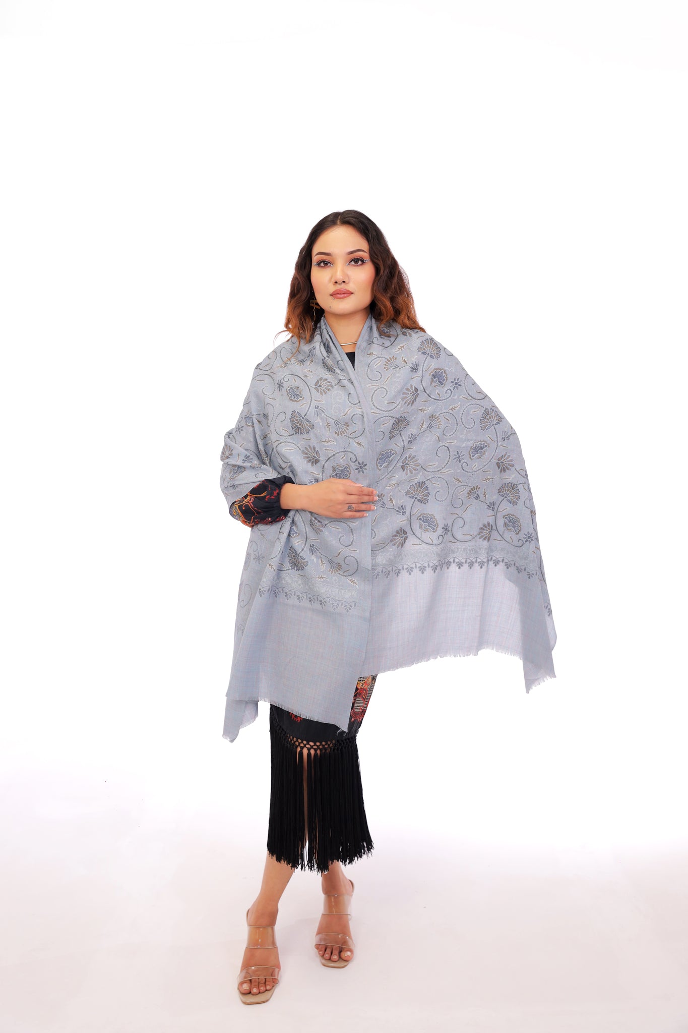 A powder blue pashmina shawl with intricate floral embroidery in silver zari and antique gold. Sitara evokes moonlit elegance with a soft shimmer and quiet sophistication—perfect for graceful evenings and refined daywear.