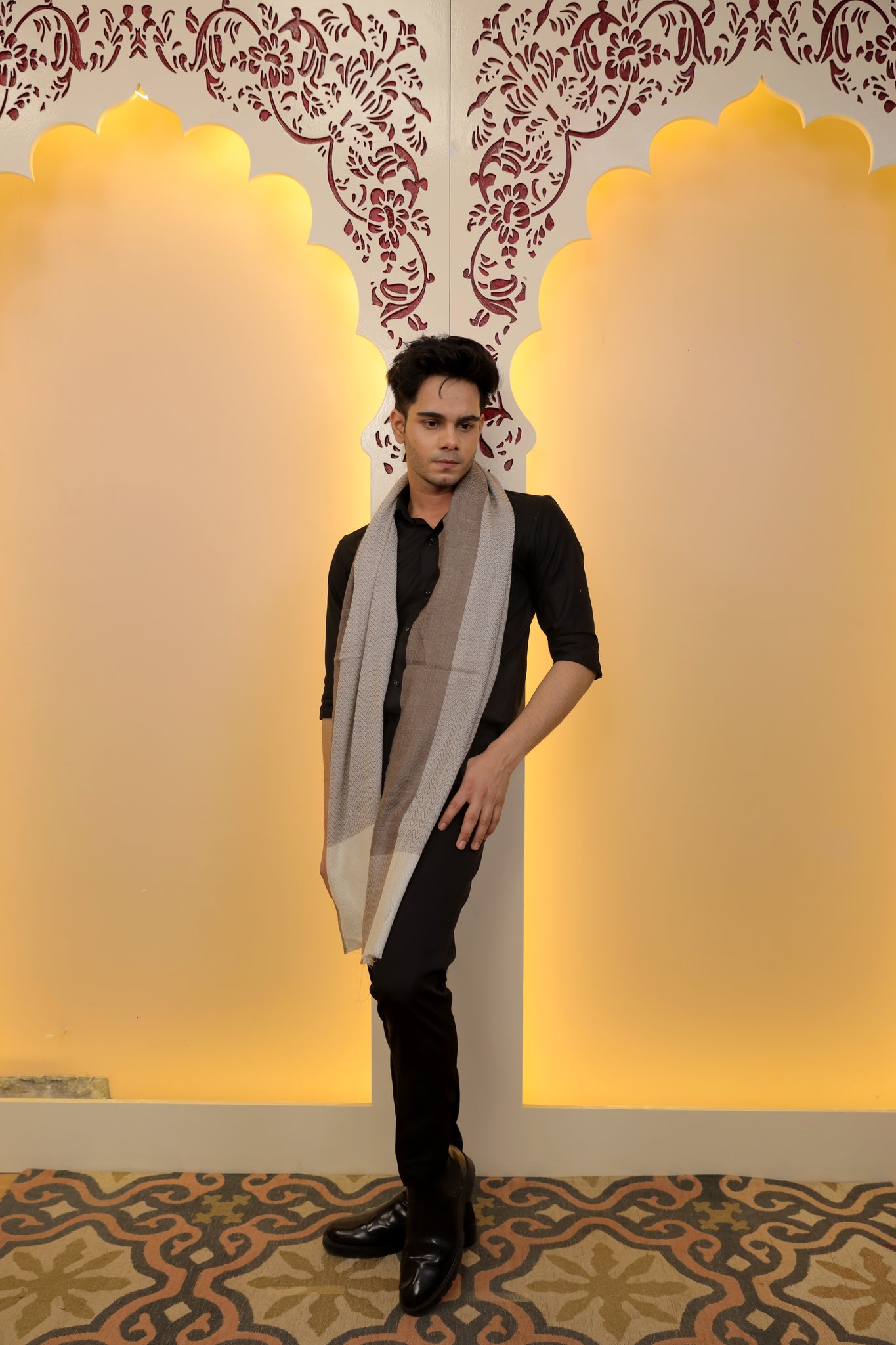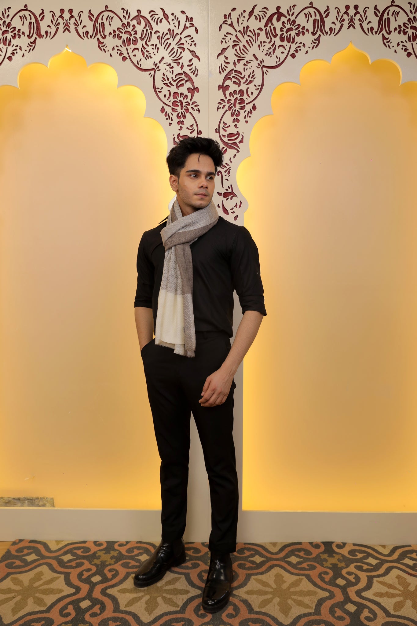 A serene fusion of soft grey and ivory, the Frosted Echo Scarf features a classic chevron weave and subtle gradient—lightweight, timeless, and effortlessly elegant.