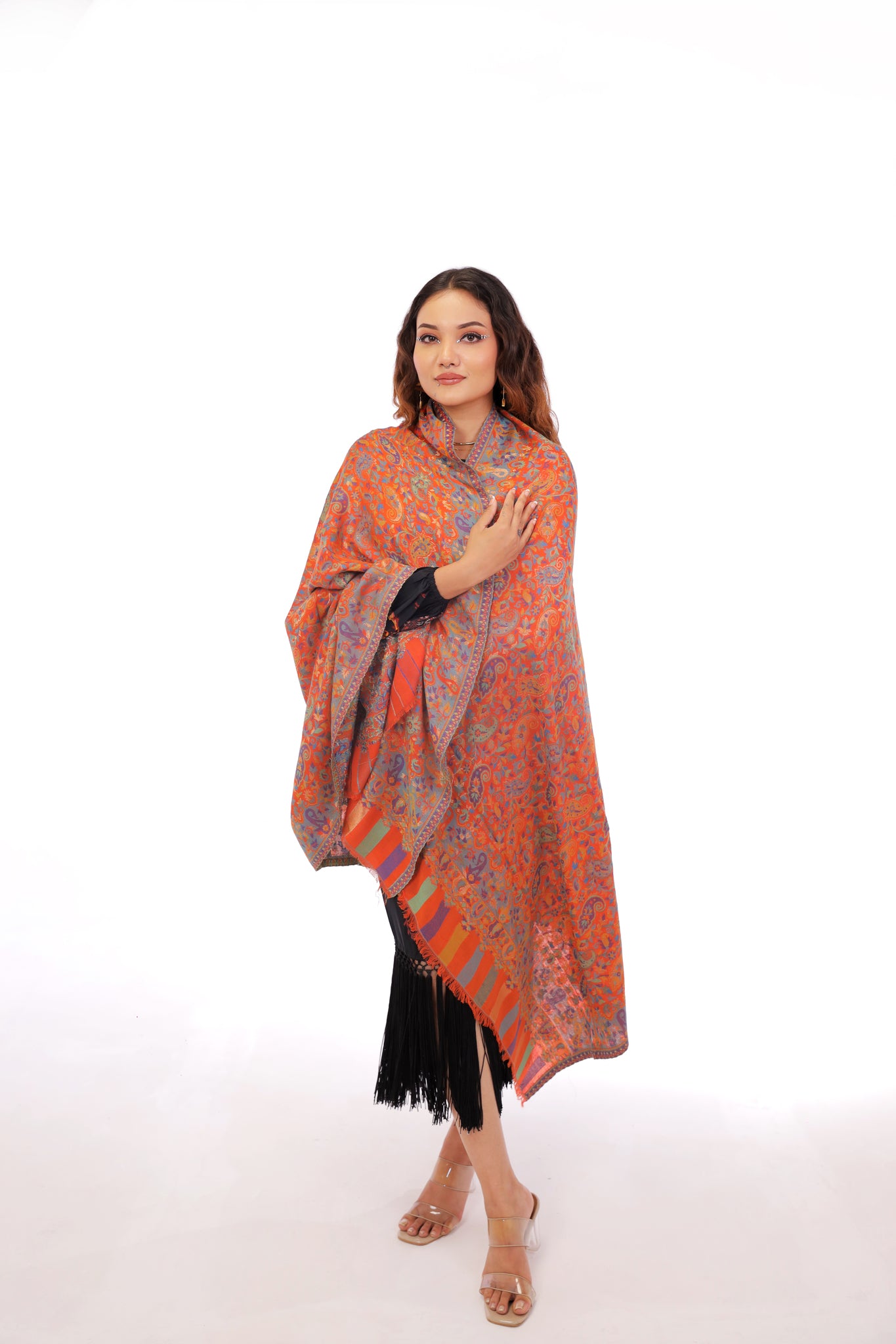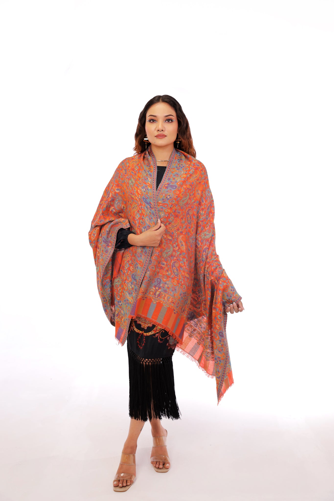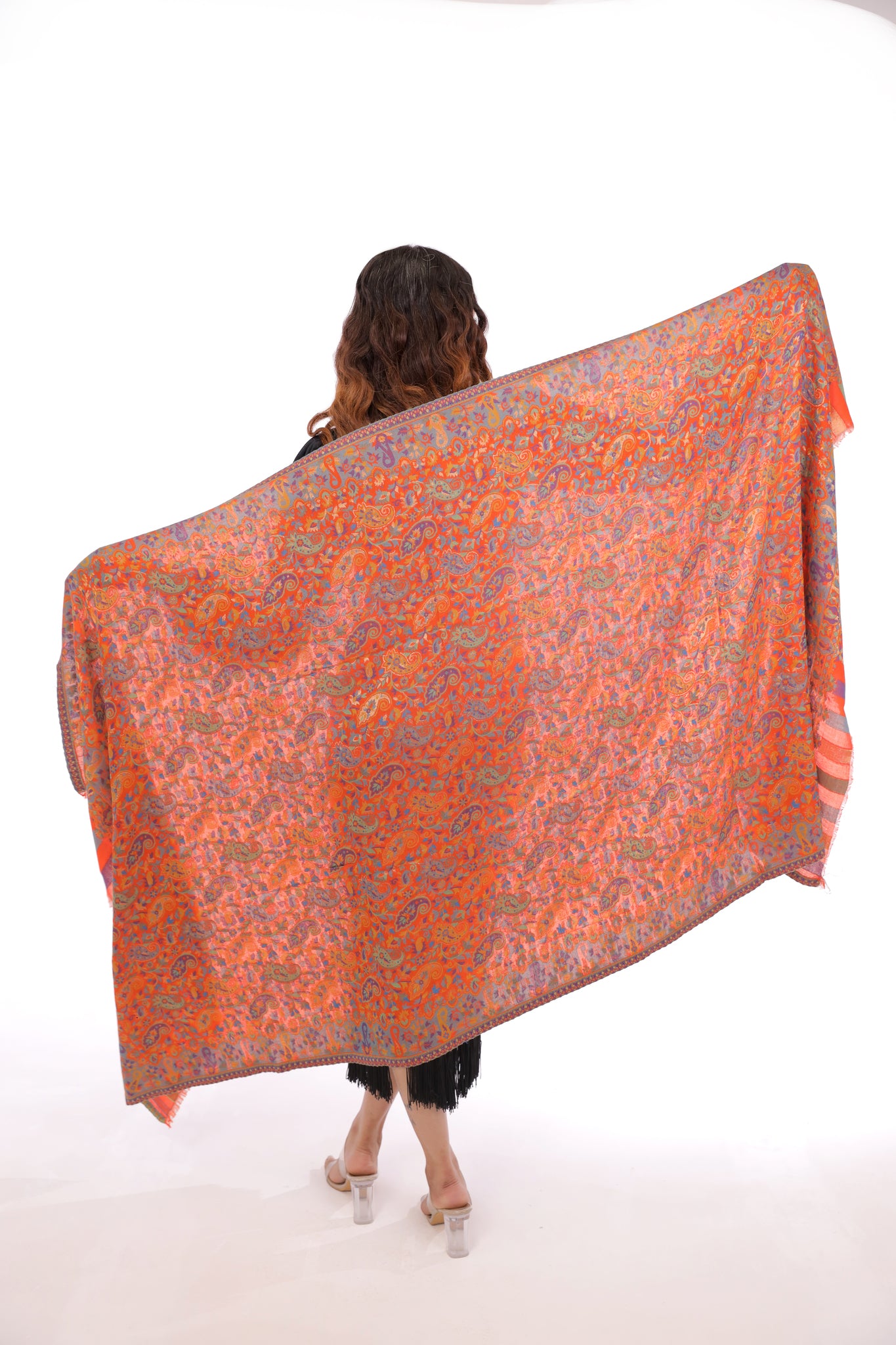 A luminous brocade shawl woven in vibrant marigold, sapphire, and violet tones with hints of gold zari. Featuring intricate paisleys and a playful striped pallu, Noorani adds festive charm and bold elegance to any look.