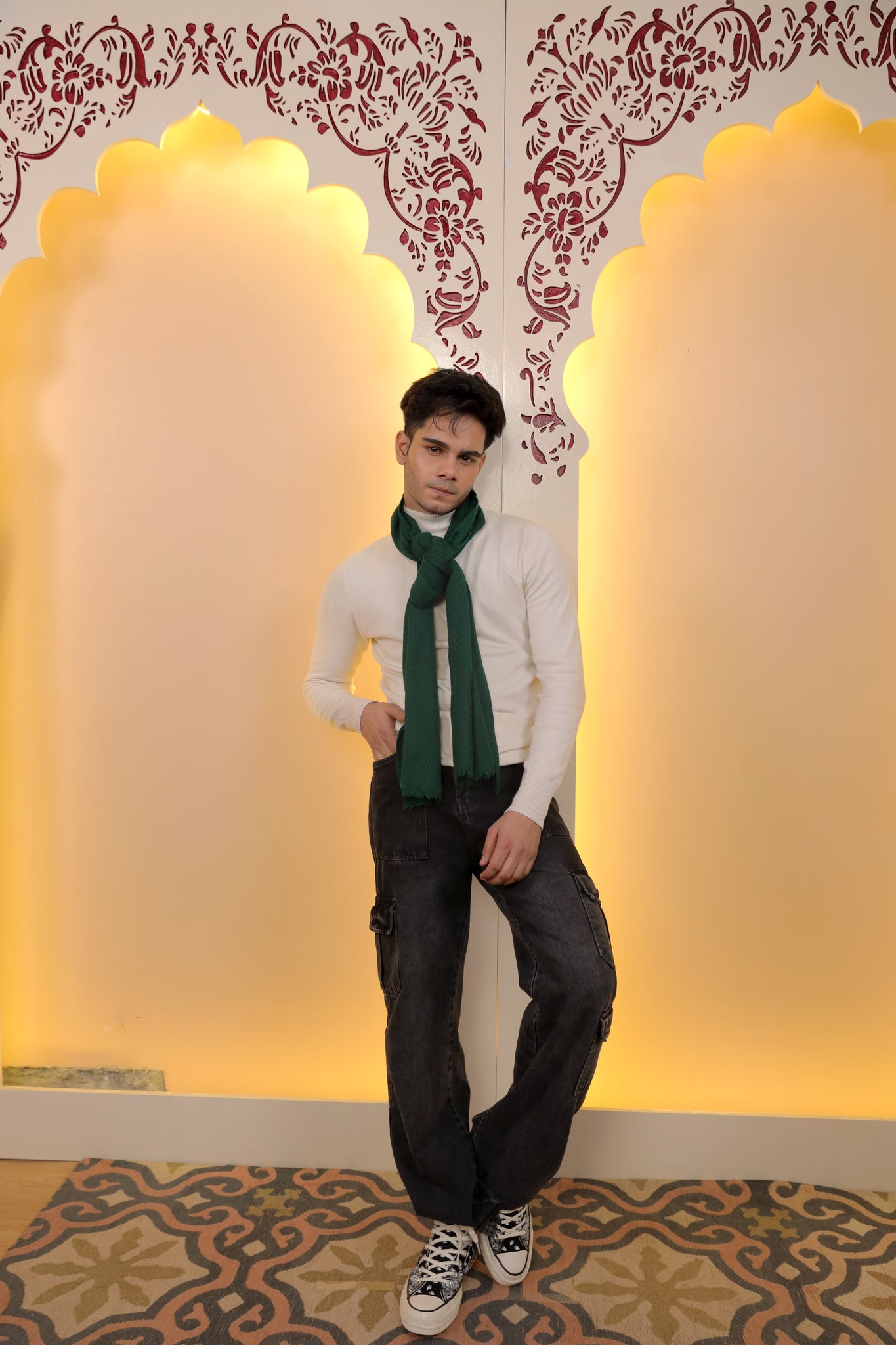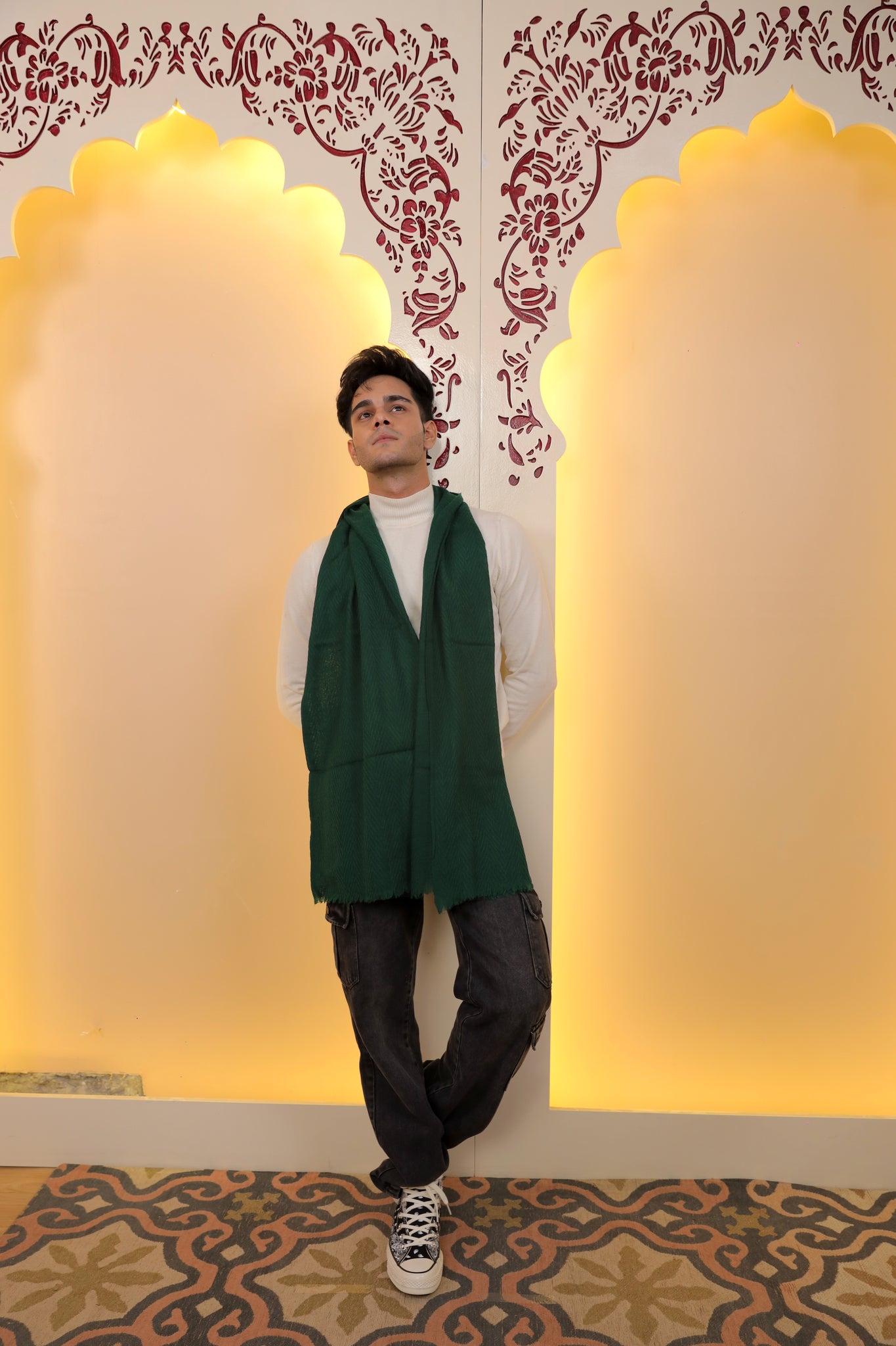 Feather-light moss green pashmina scarf with subtle herringbone texture—understated elegance for any occasion.