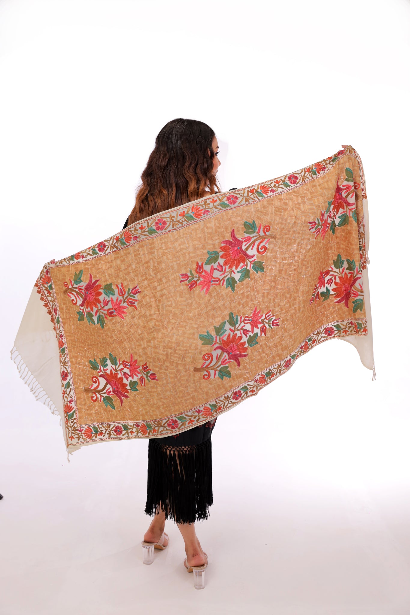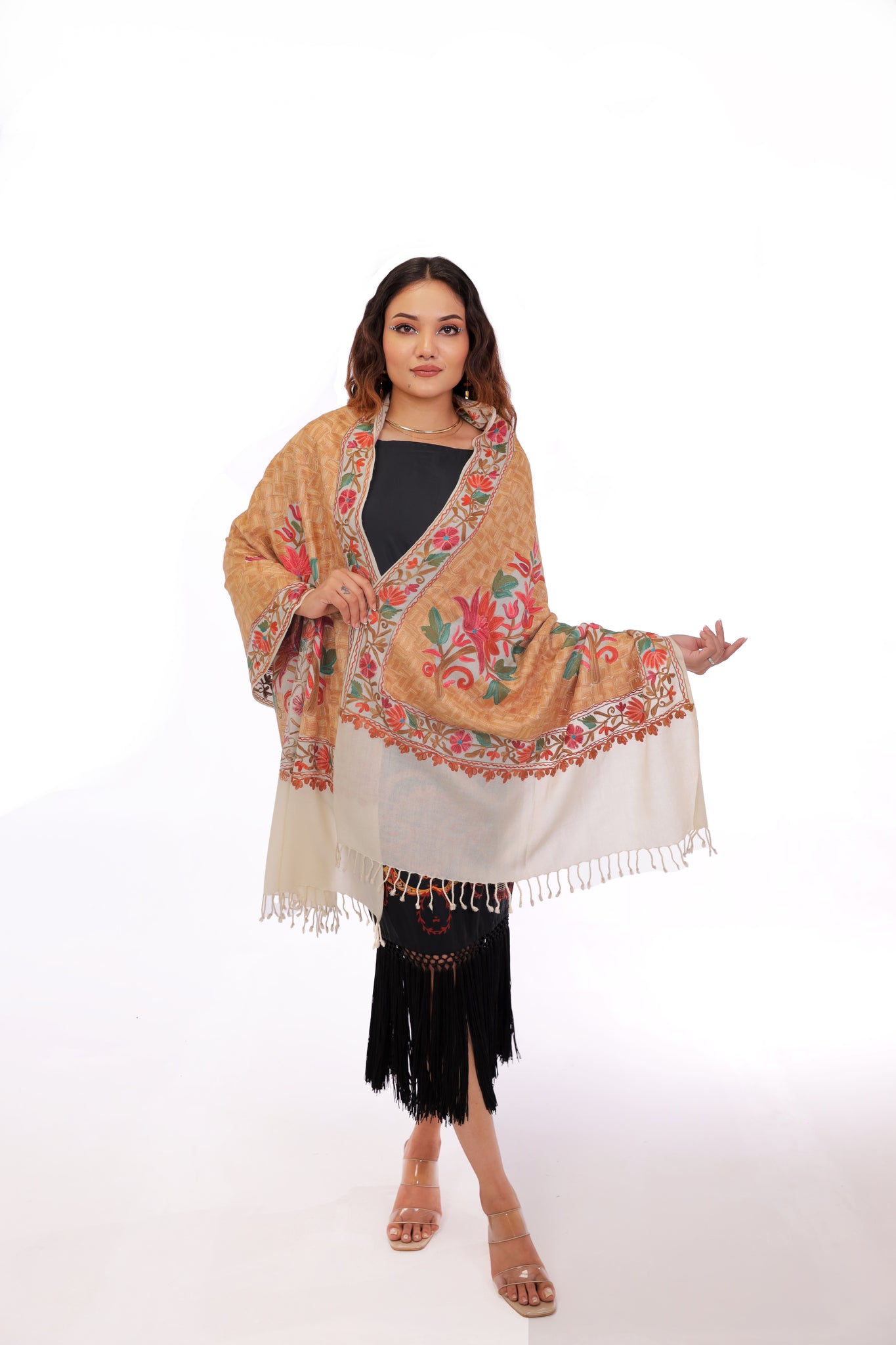 A luxurious cream Pashmina shawl adorned with intricate multicolor floral embroidery. Lightweight, elegant, and perfect for elevating both everyday and evening looks.