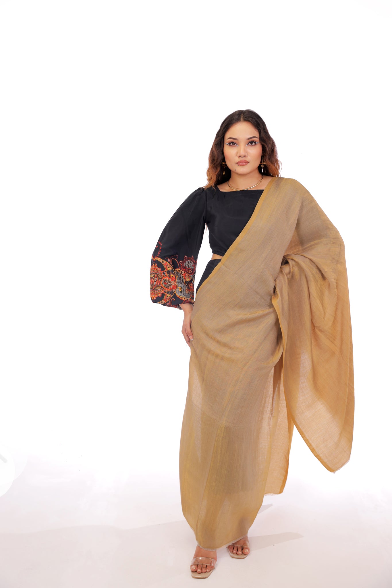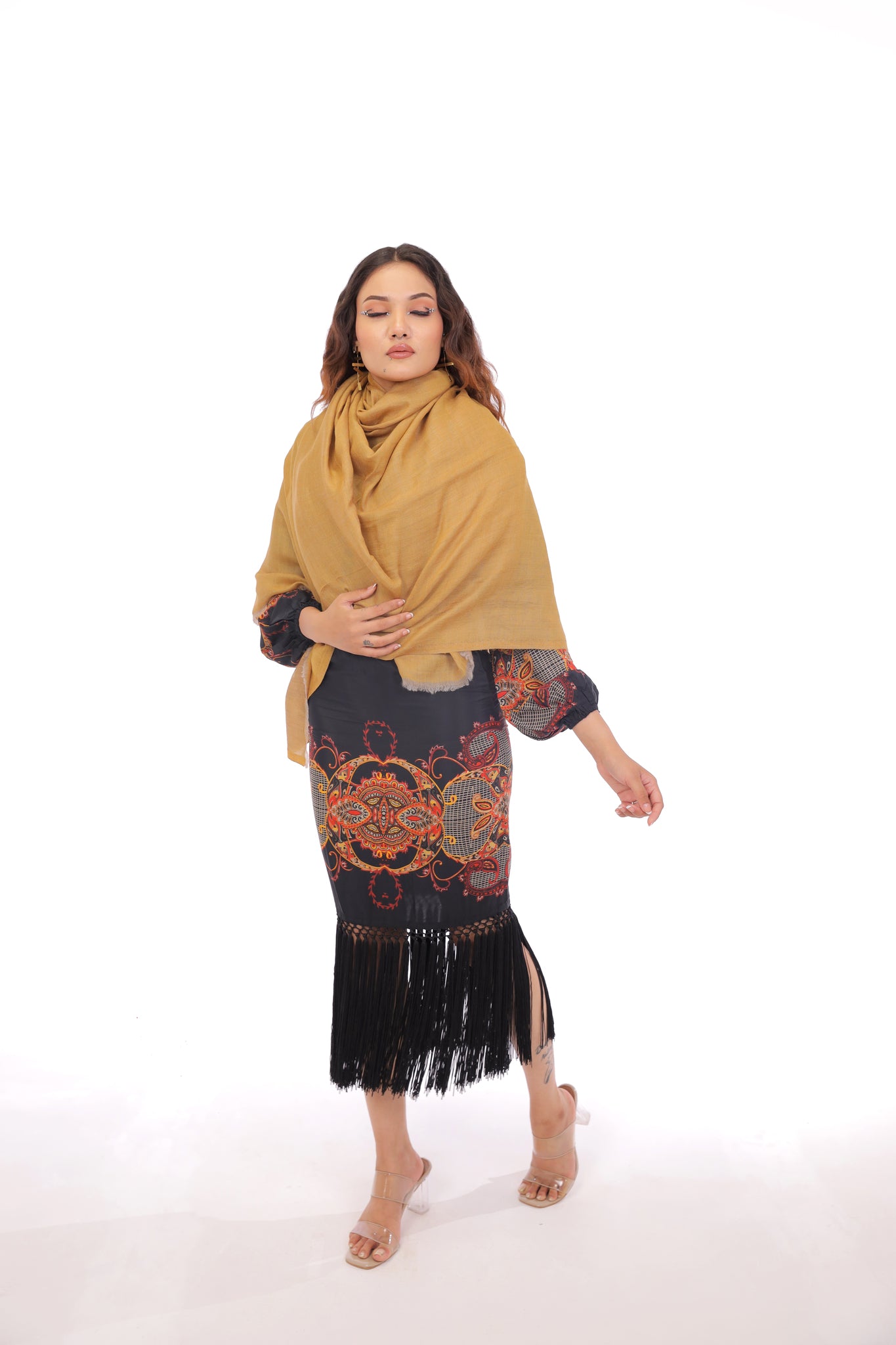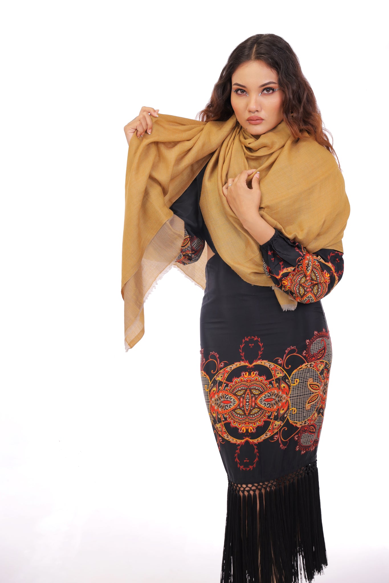 A luminous golden pashmina shawl with subtle zari brilliance—Golden Era brings timeless elegance and royal charm to your wardrobe.