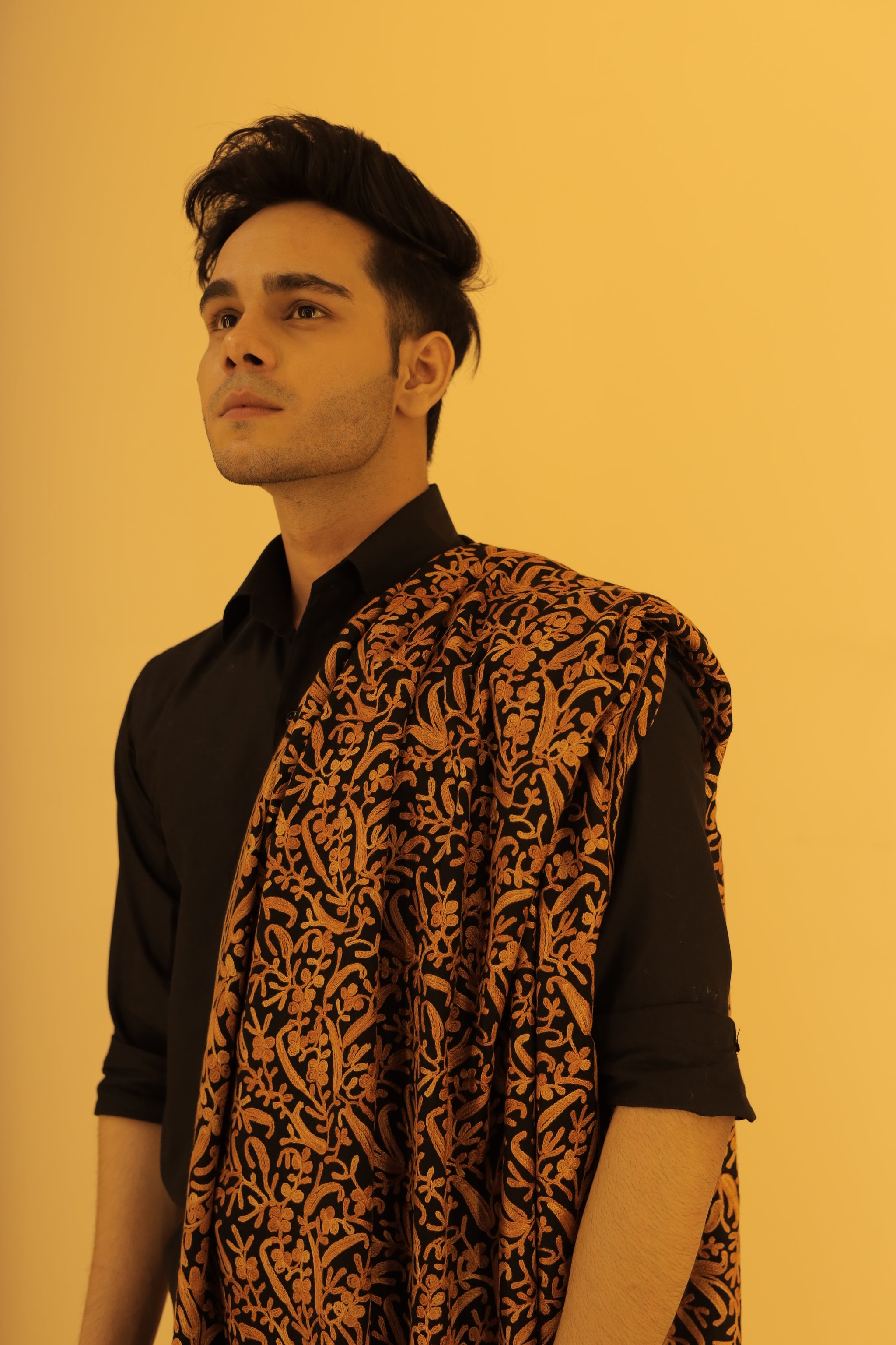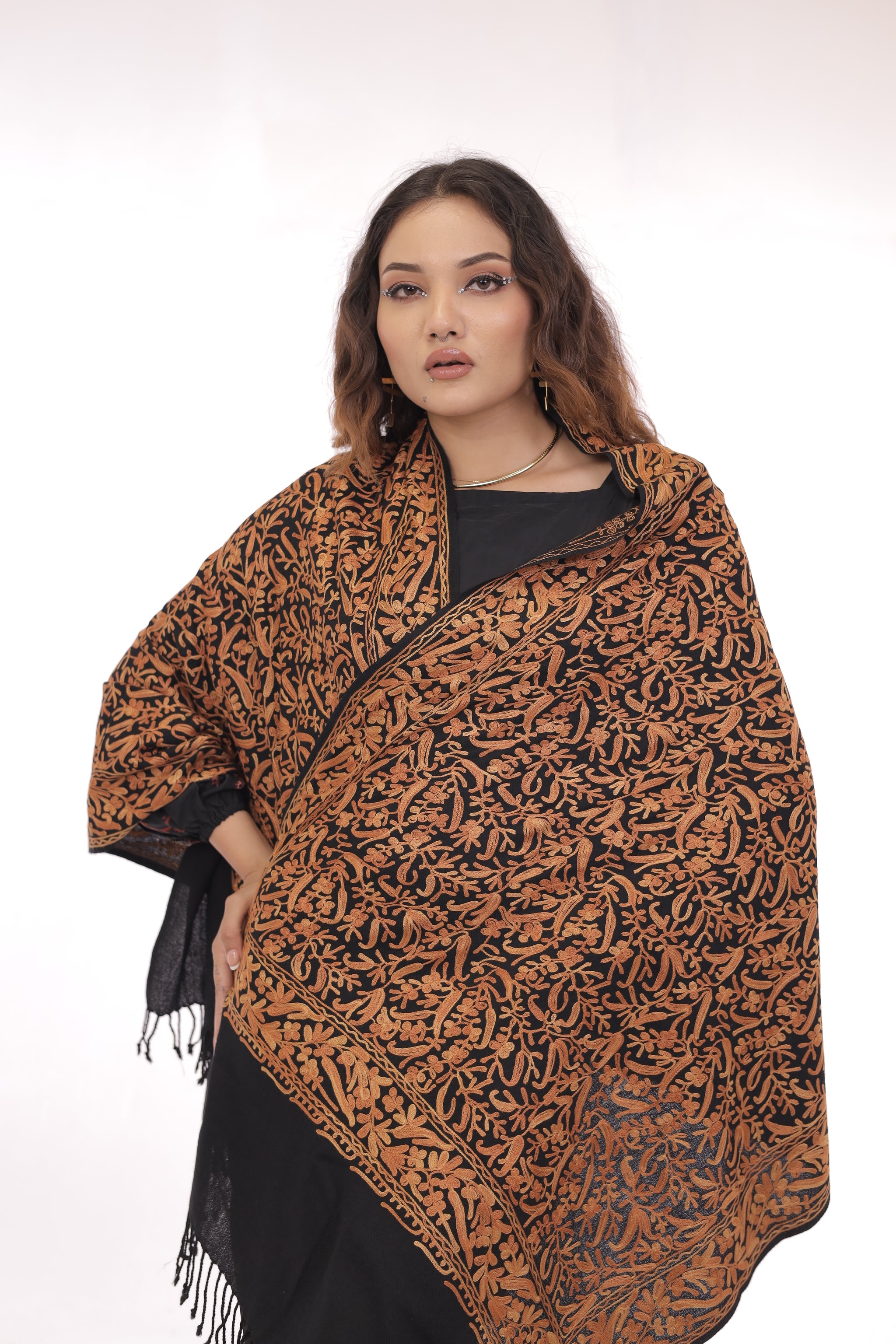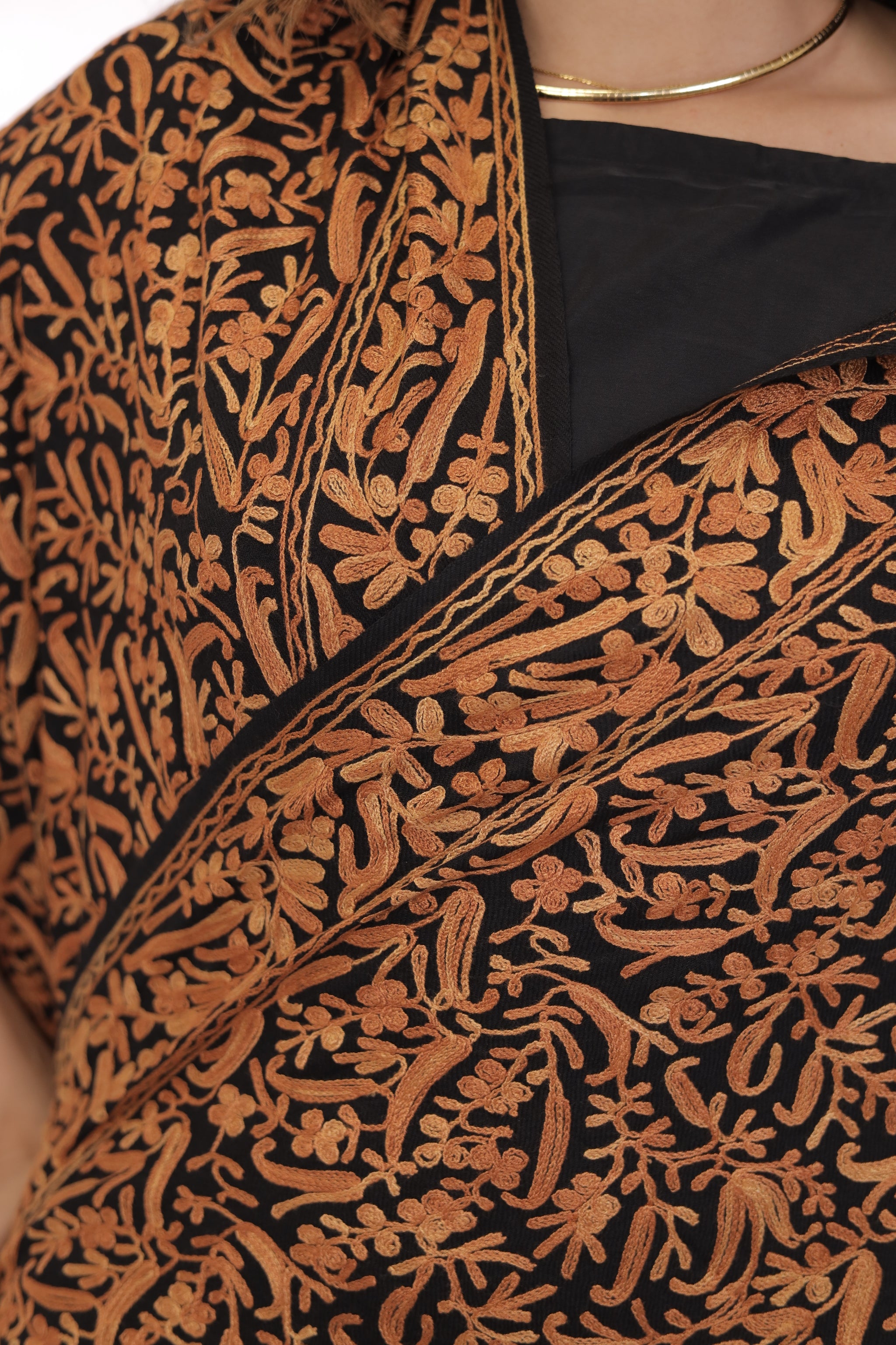 A timeless black pashmina shawl, hand-embroidered with intricate aari work in rich rust and cocoa tones—elegant, warm, and rooted in Kashmiri tradition.