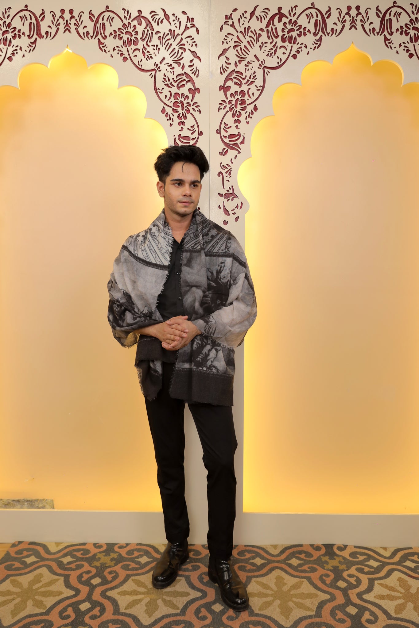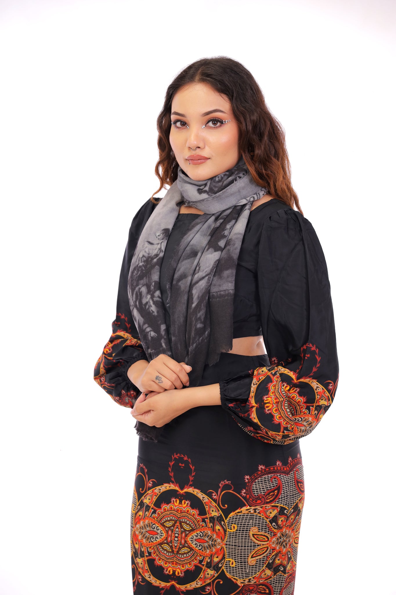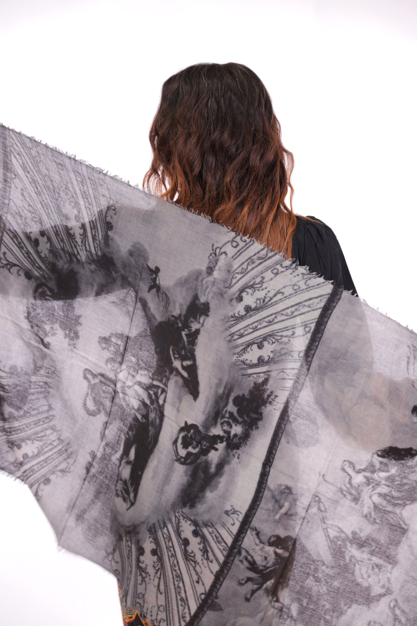 A tribute to Baroque-era artistry, this monochrome scarf blends mythological elegance with wearable luxury — printed on an airy pashmina blend for timeless sophistication.