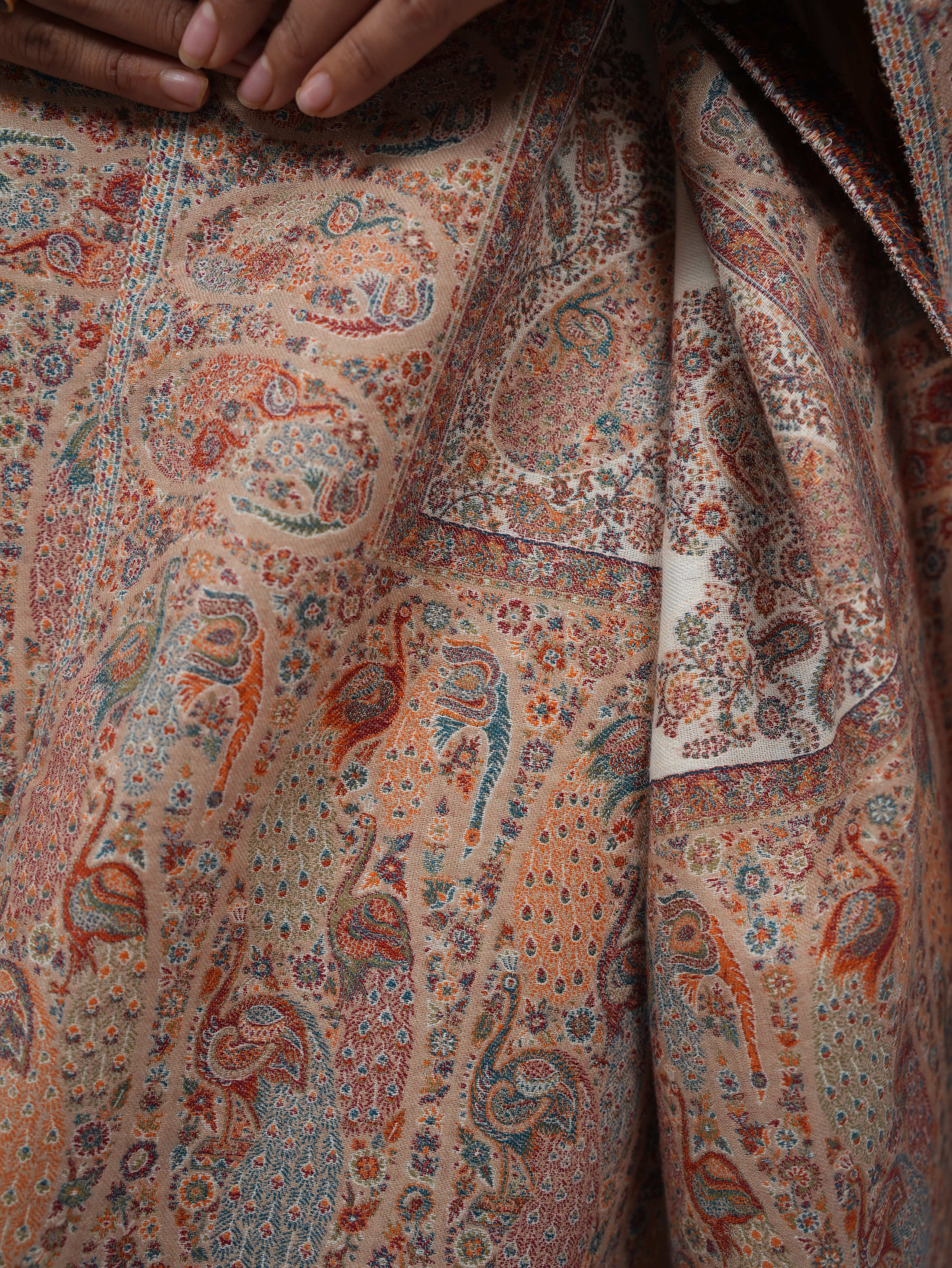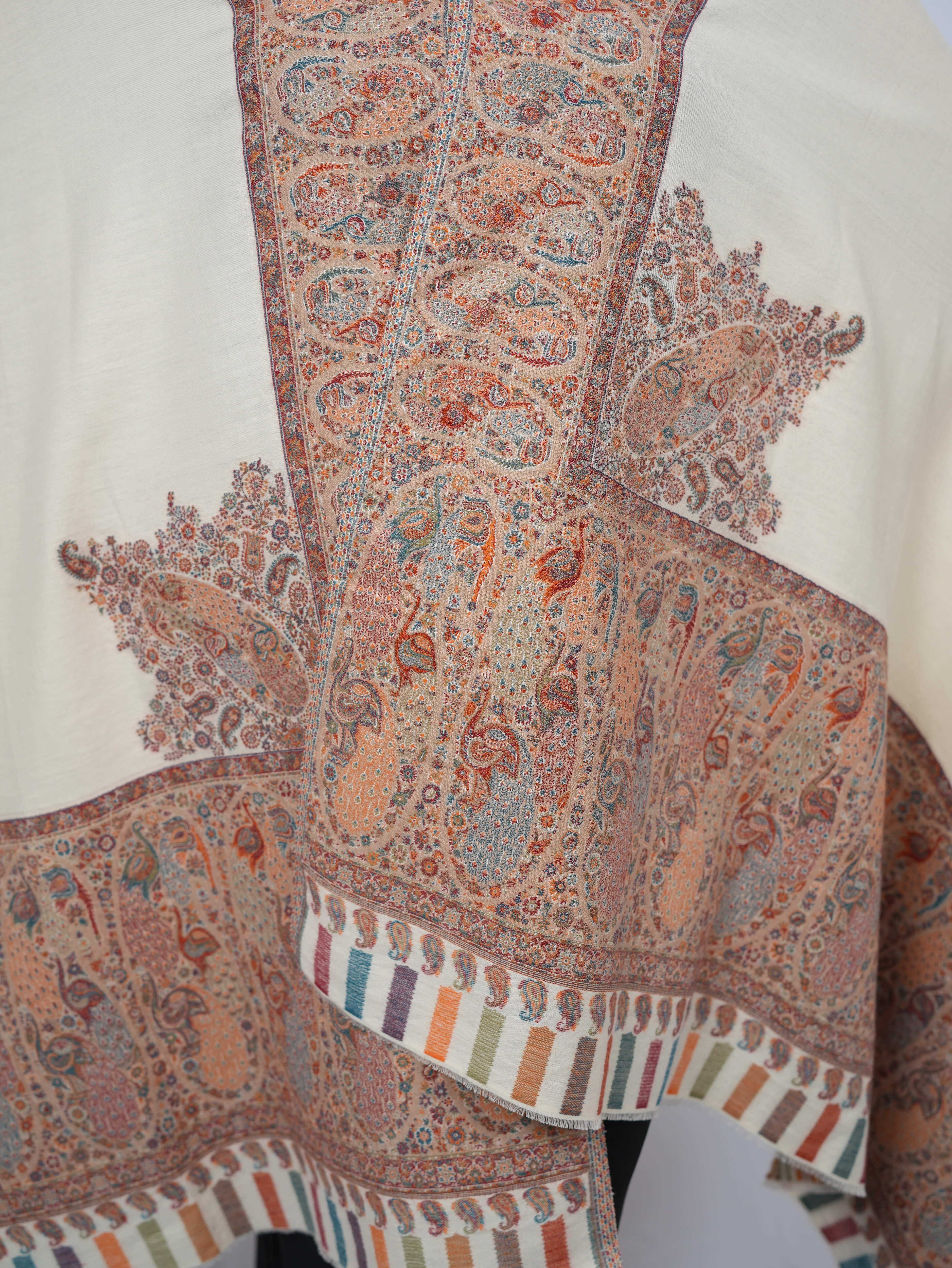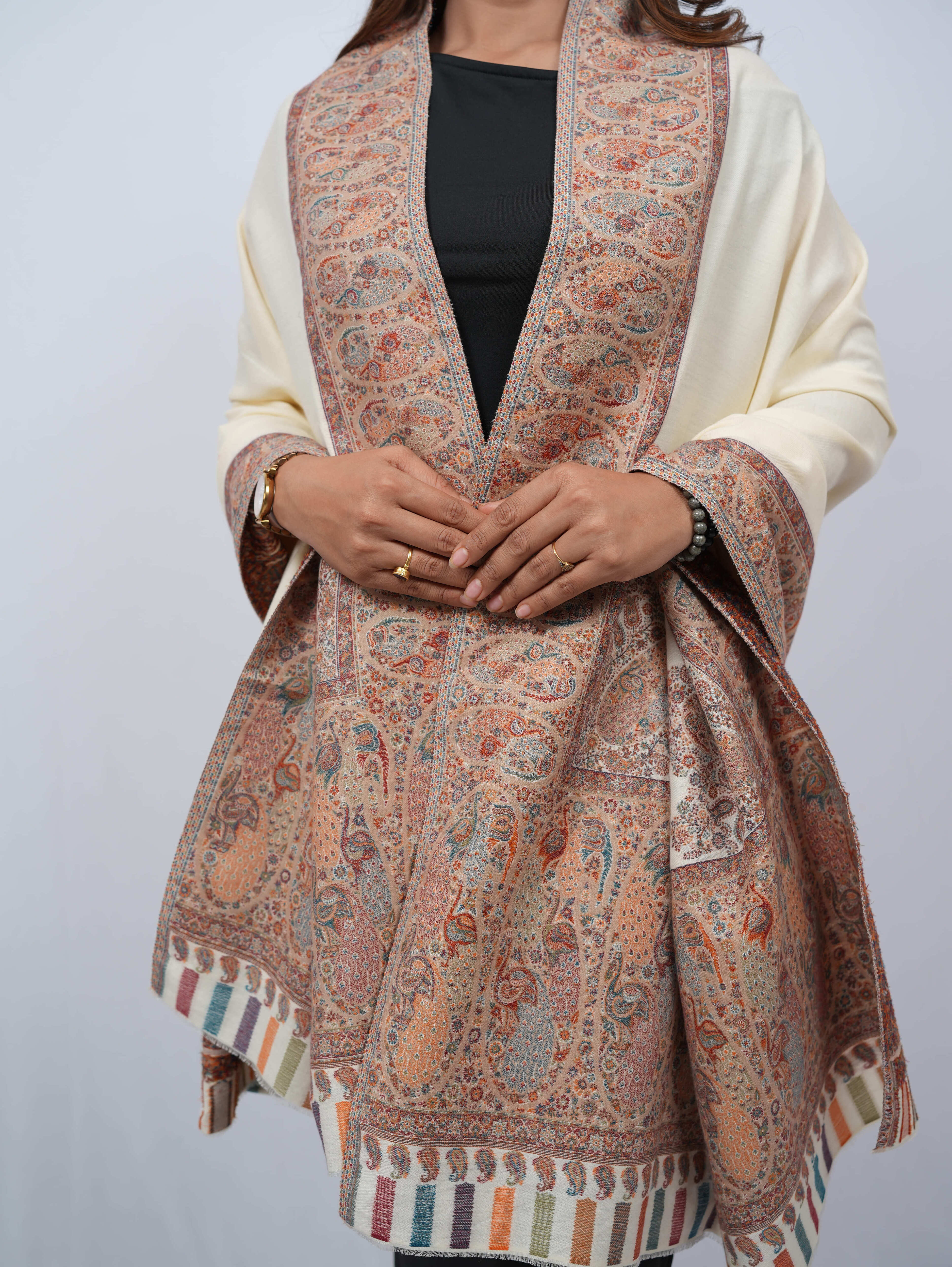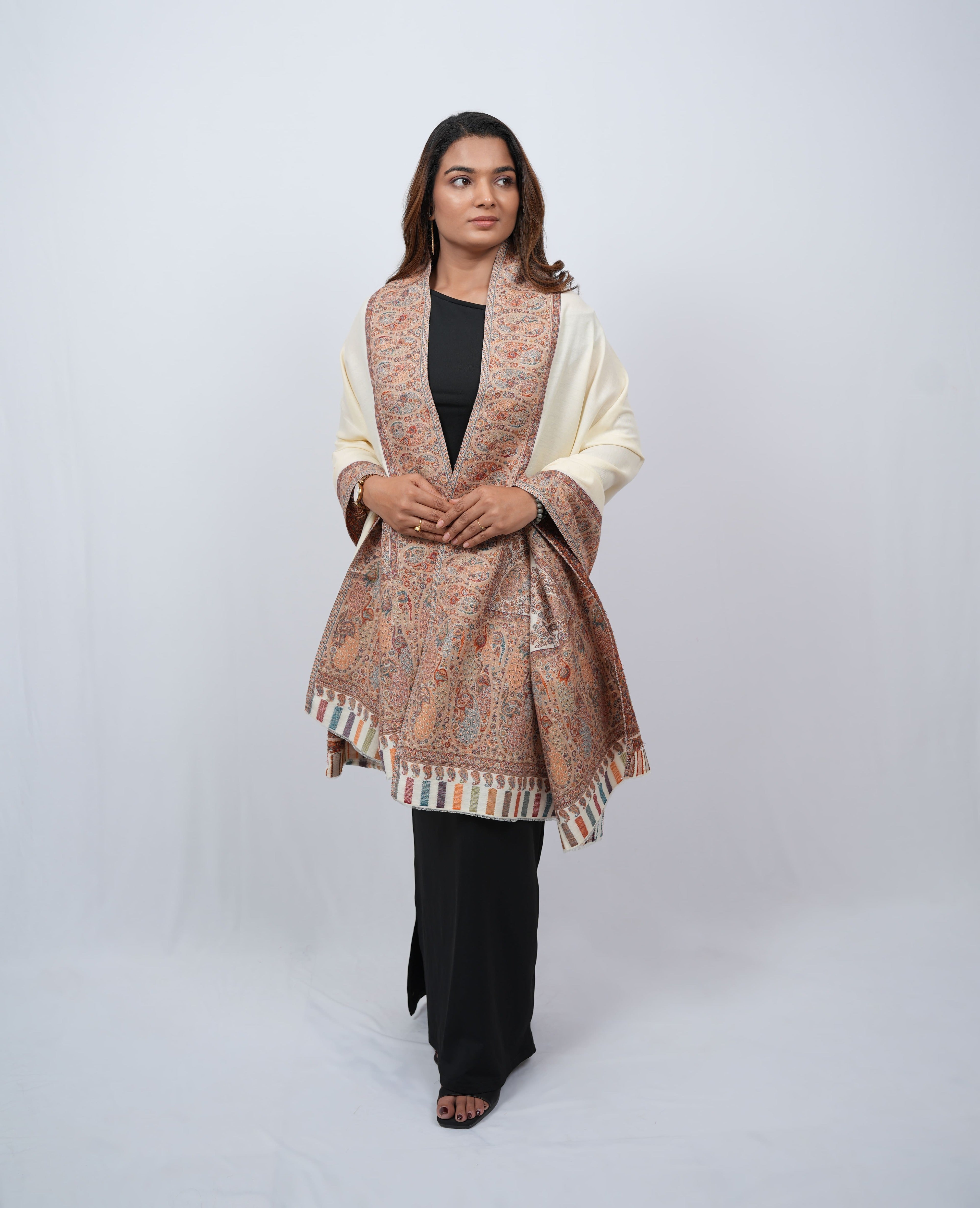 An ivory pashmina shawl adorned with intricate paisley detailing, designed for timeless elegance and refined luxury.