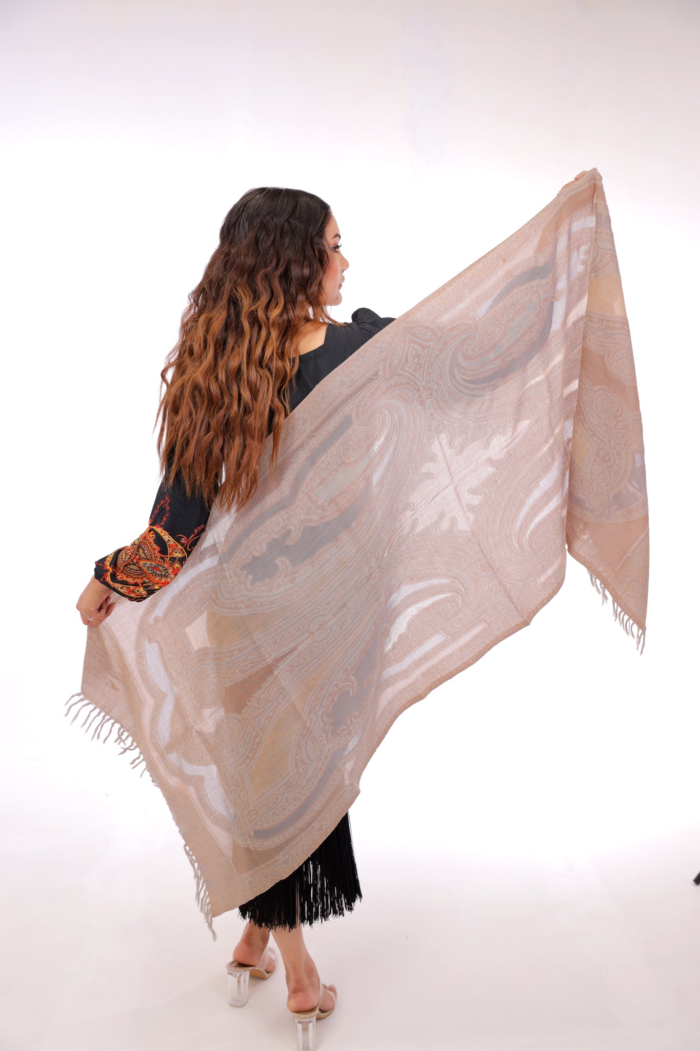 An earthy-toned pure Pashmina shawl with artisan-crafted motifs, radiating understated luxury and natural elegance.