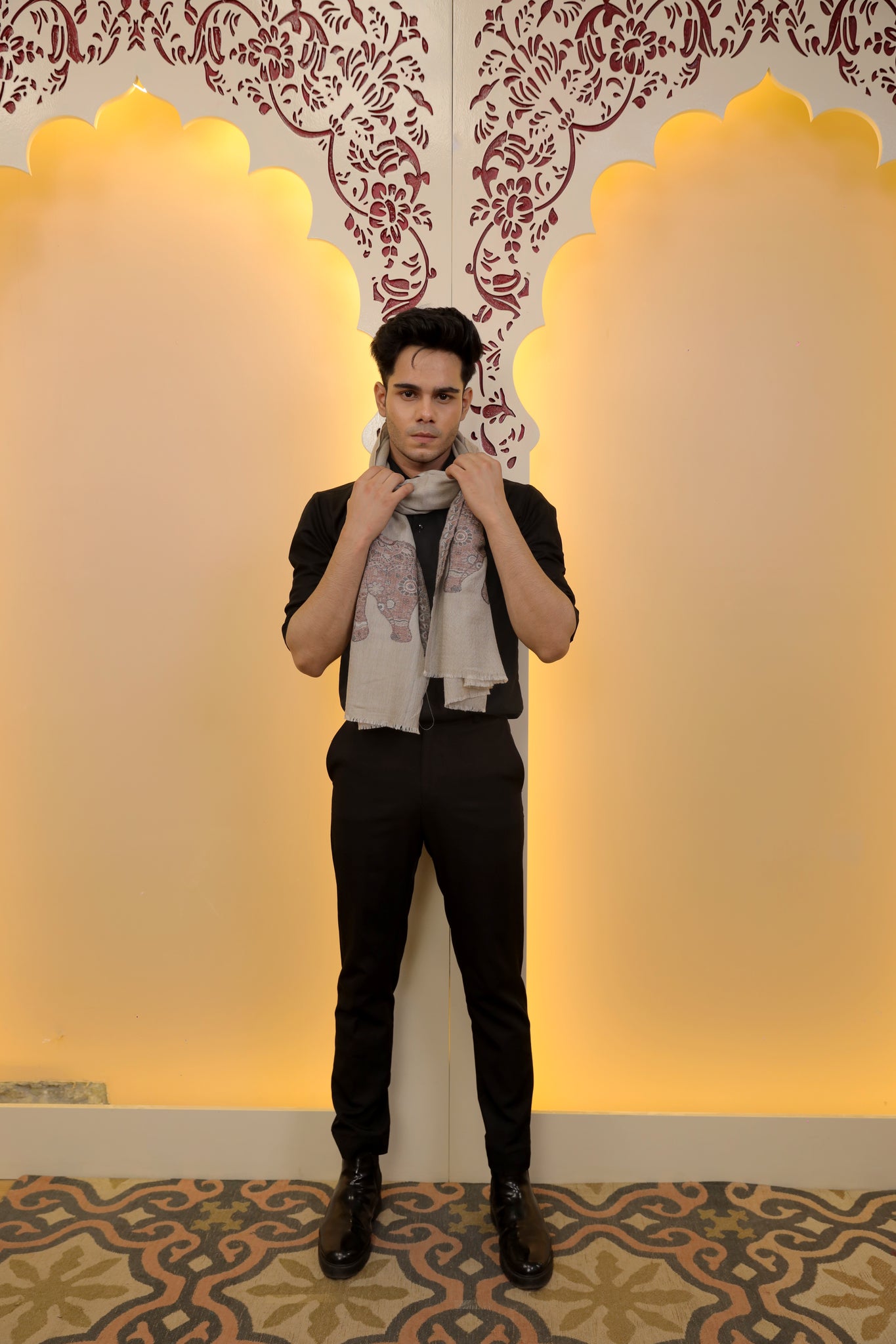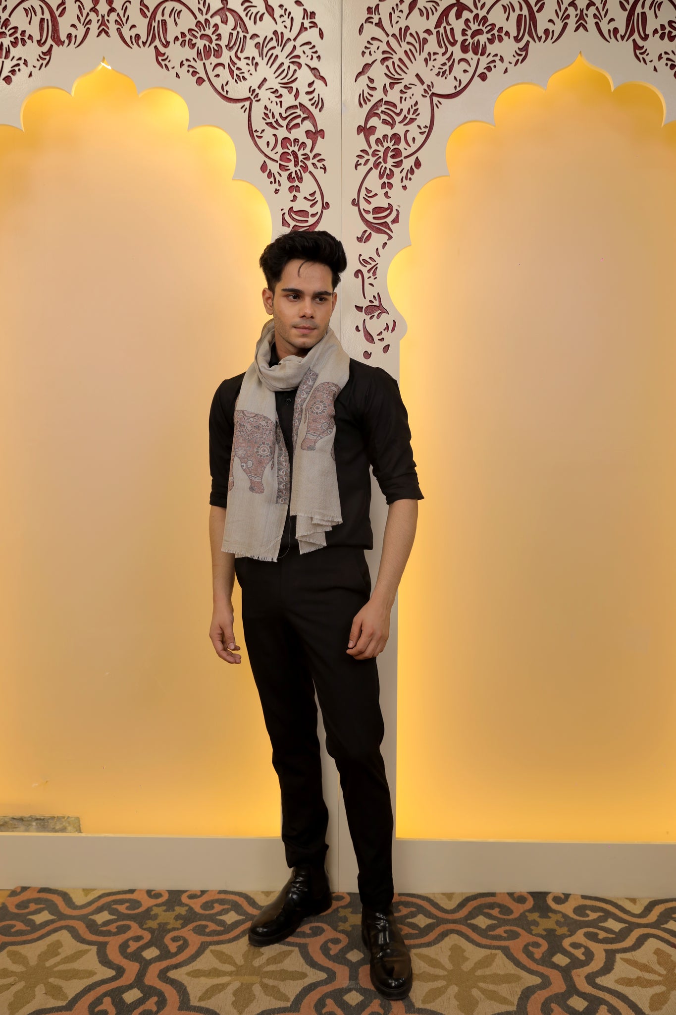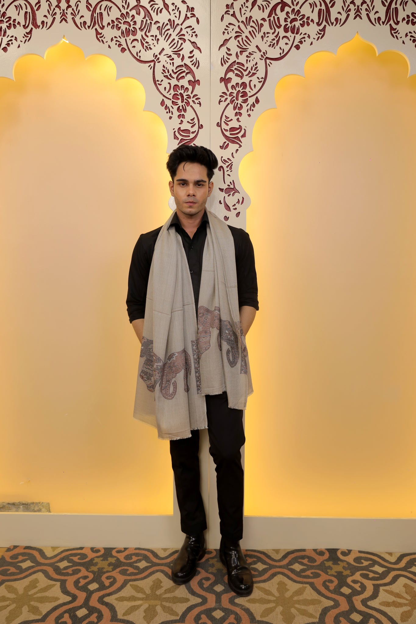A tribute to heritage and grace, this taupe-hued scarf features intricately woven elephant motifs in earthy tones — a soft pashmina blend that tells a story of strength and tradition.