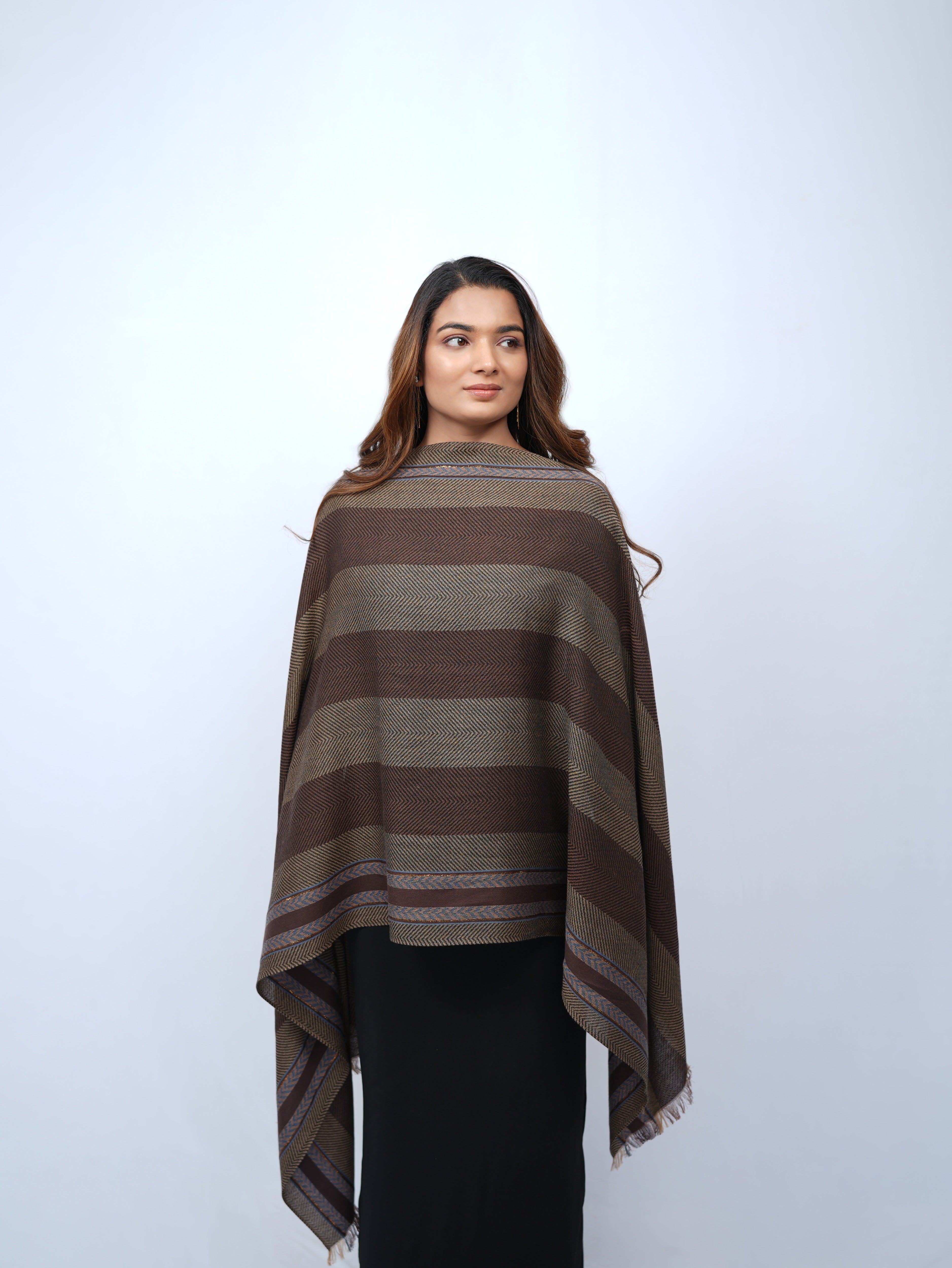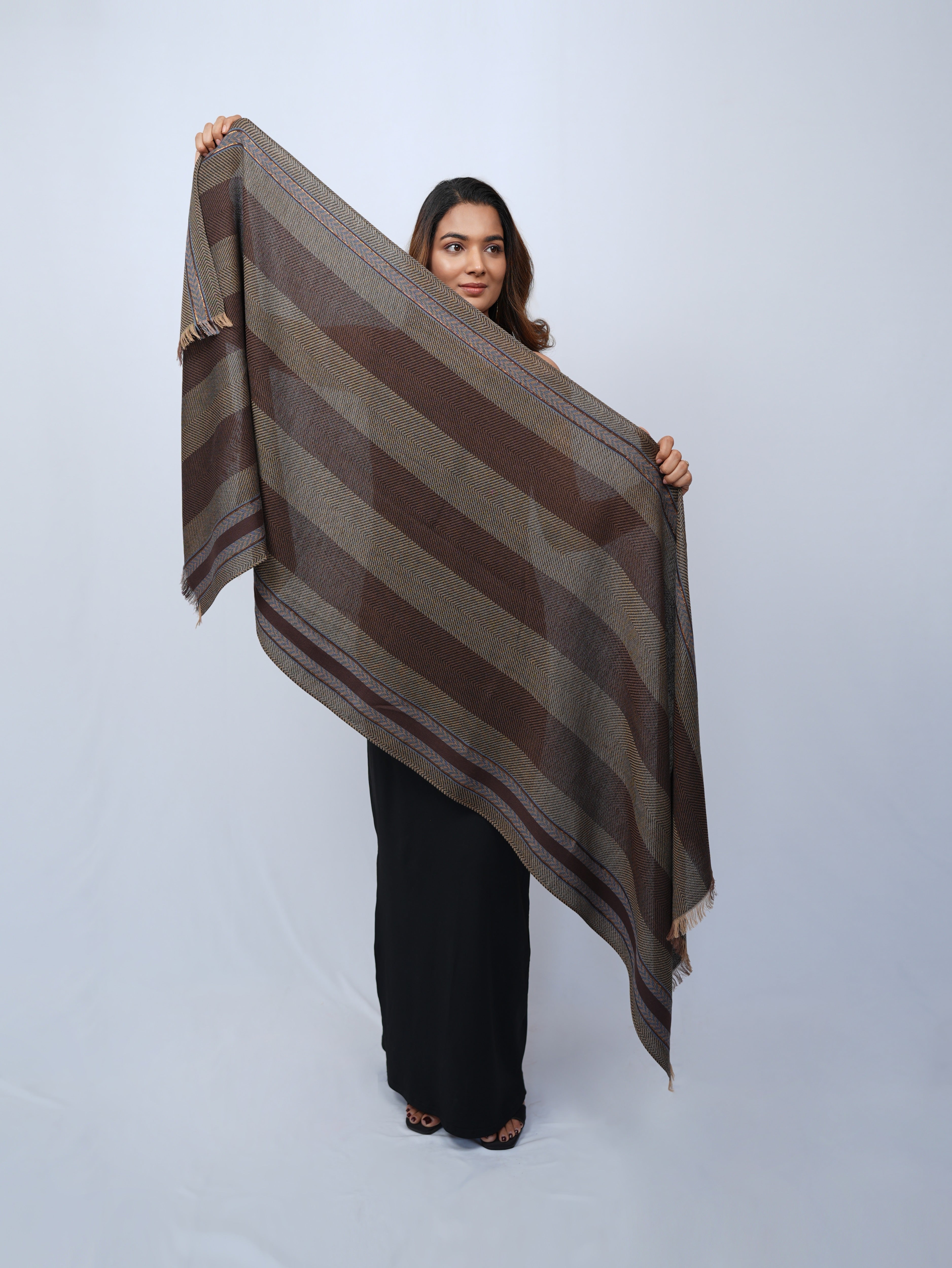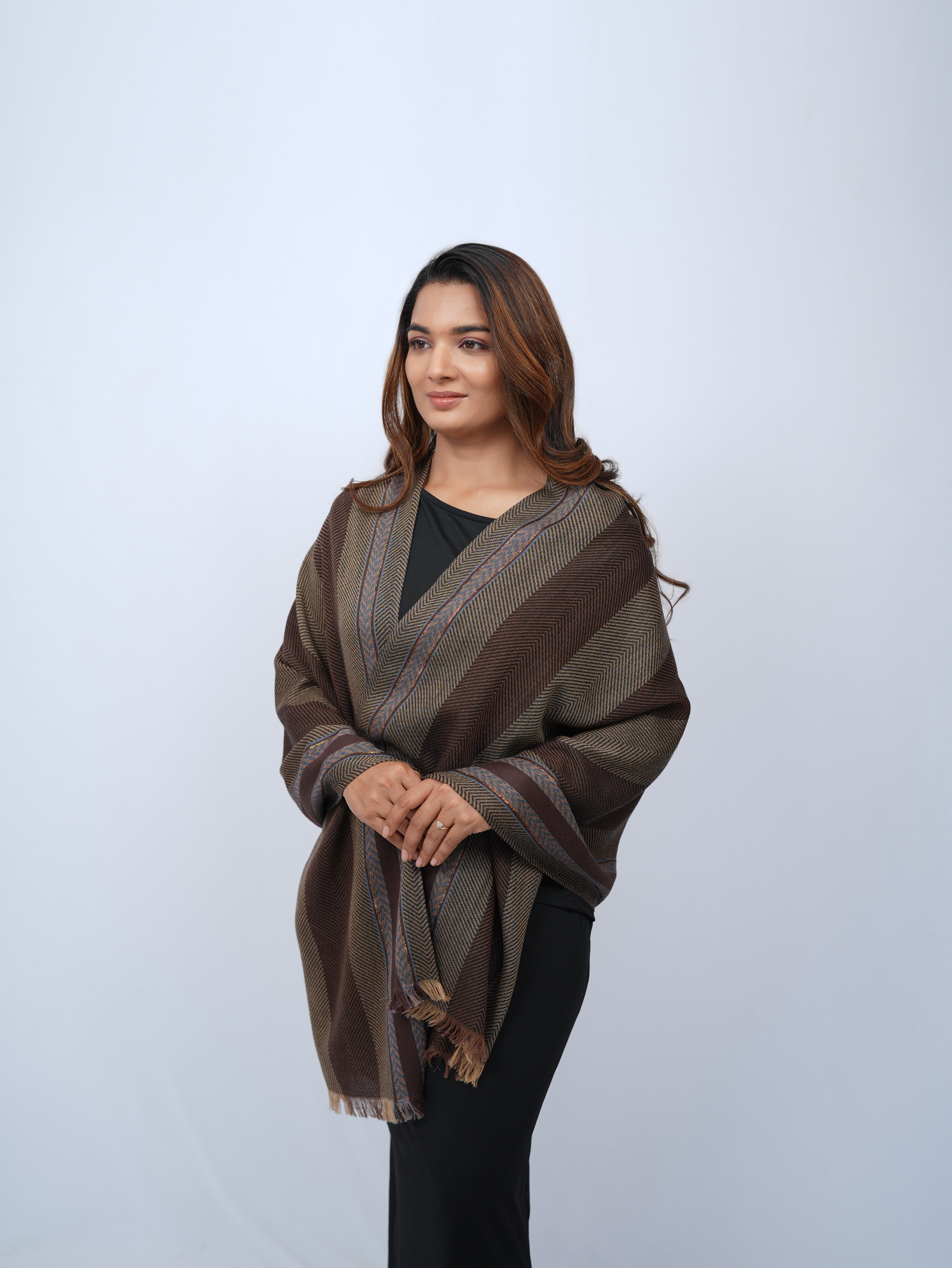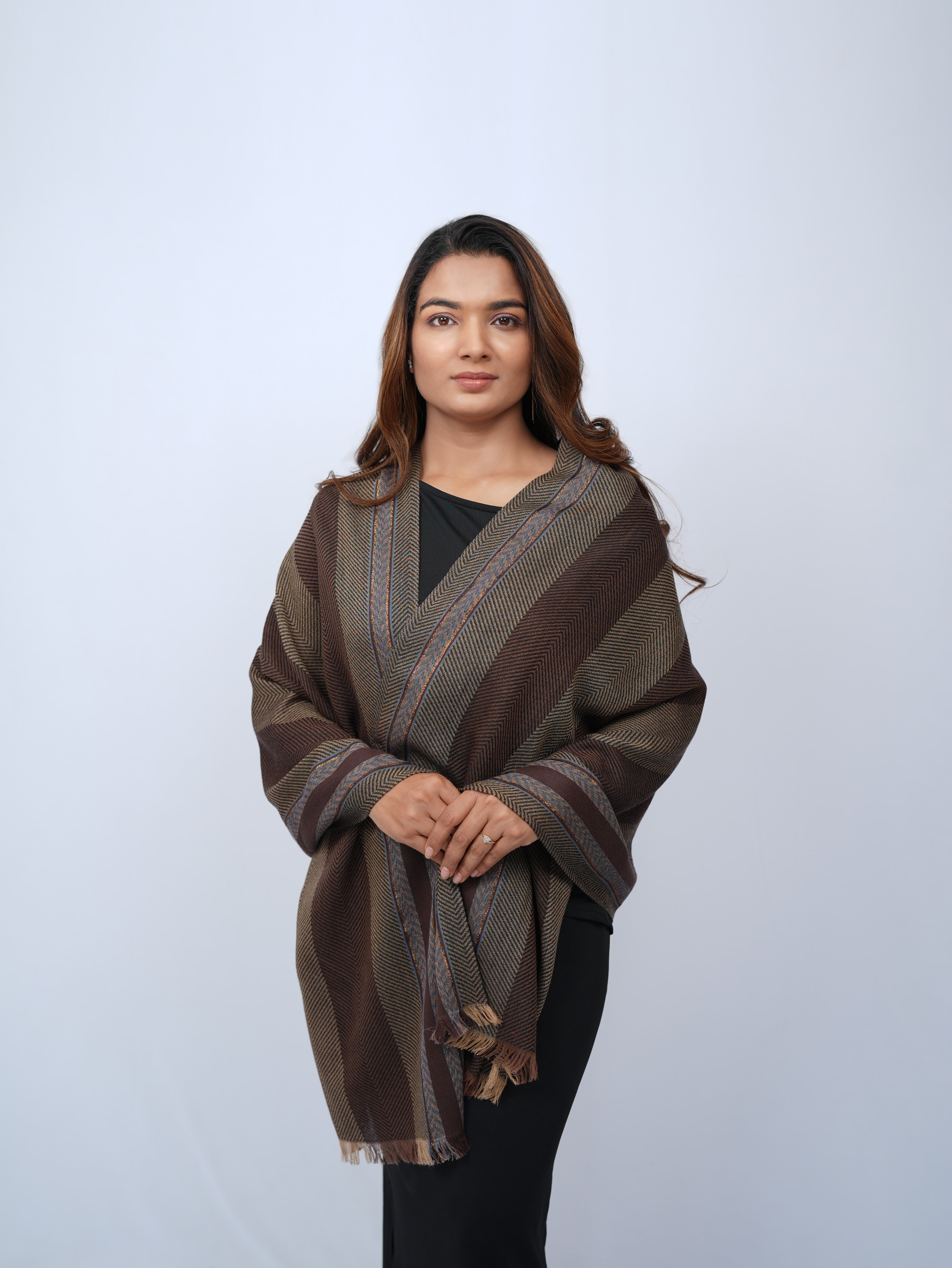 A refined wool scarf with classic striped detailing and subtle herringbone texture, embodying timeless sophistication.