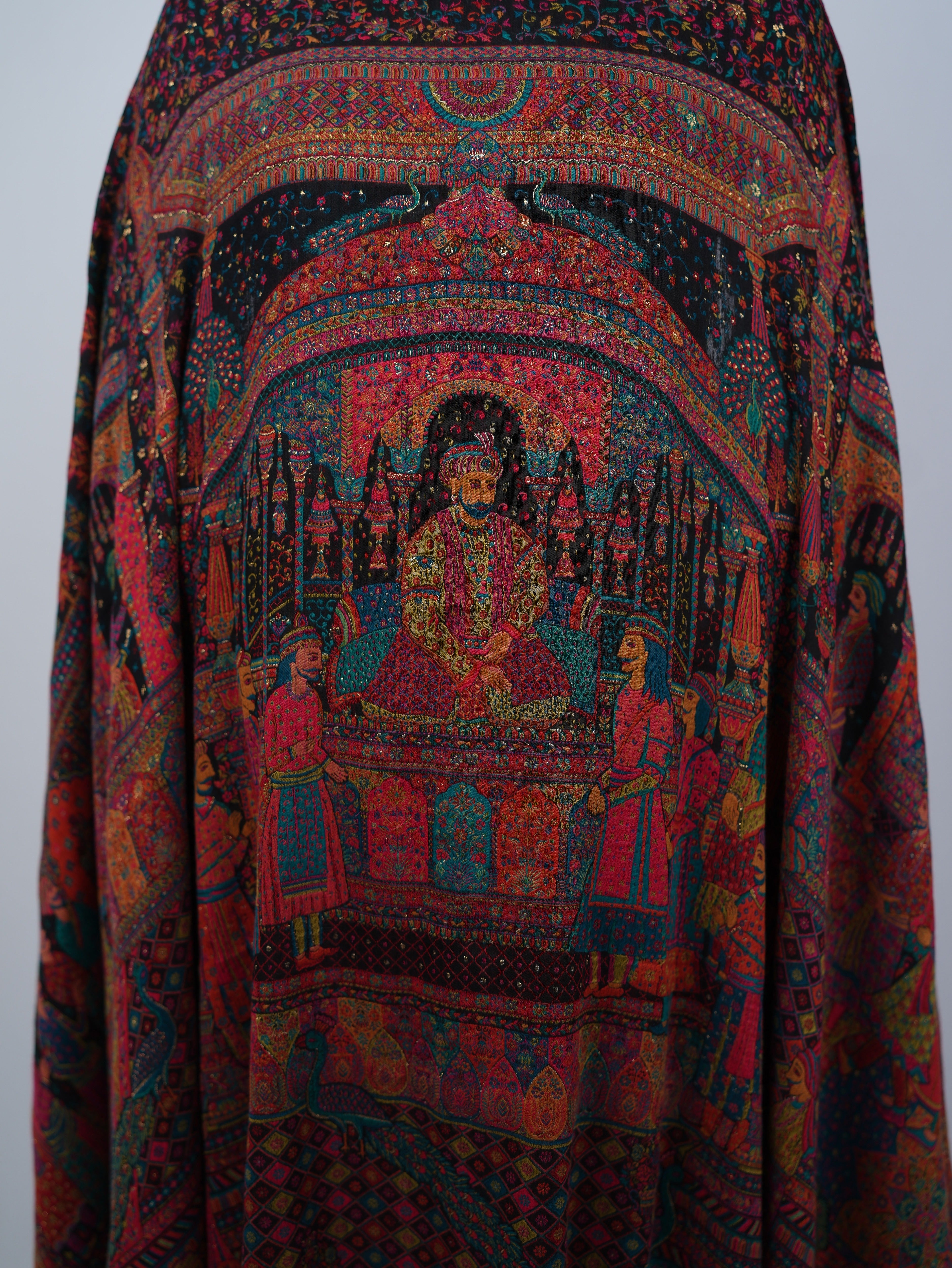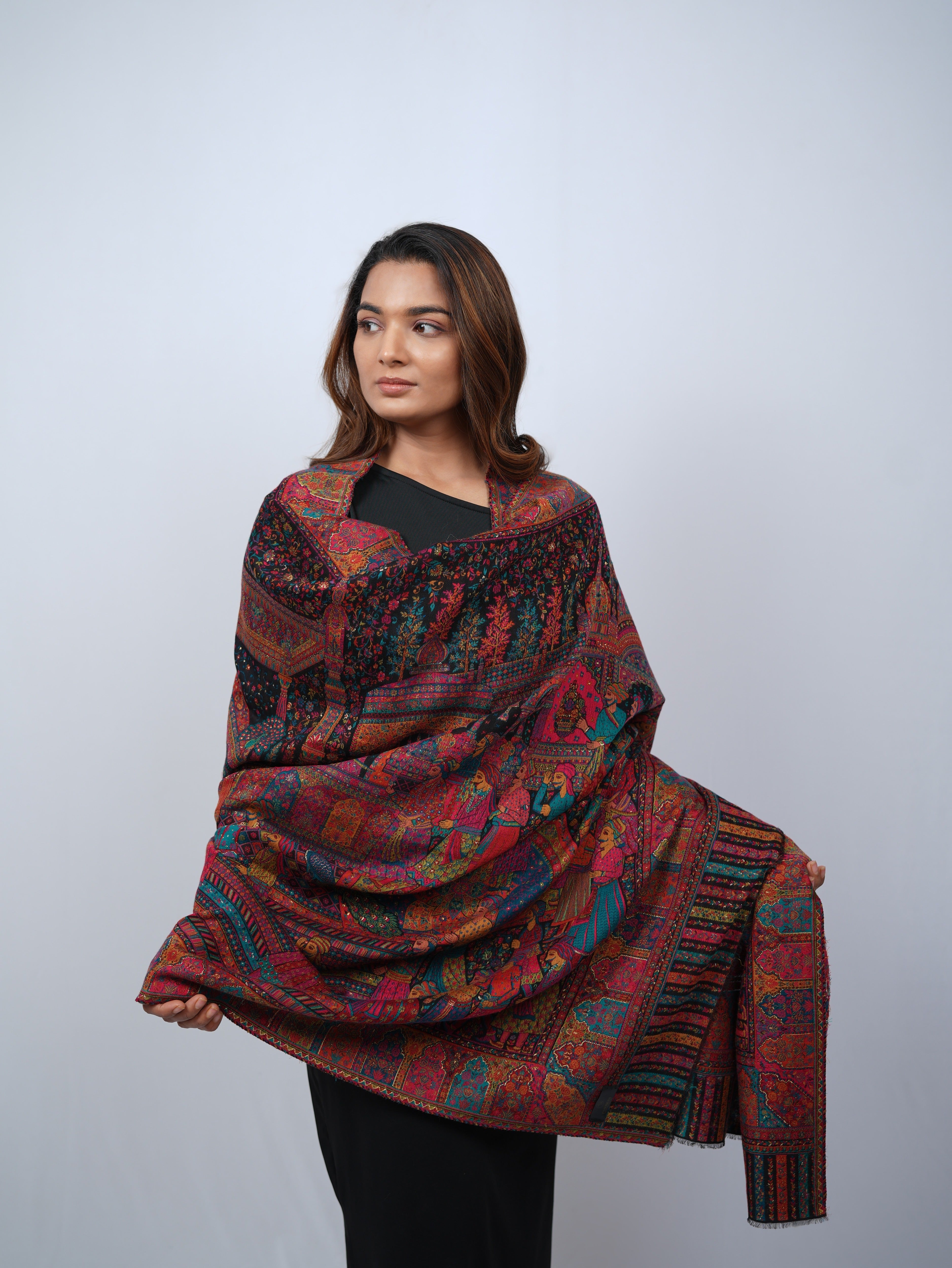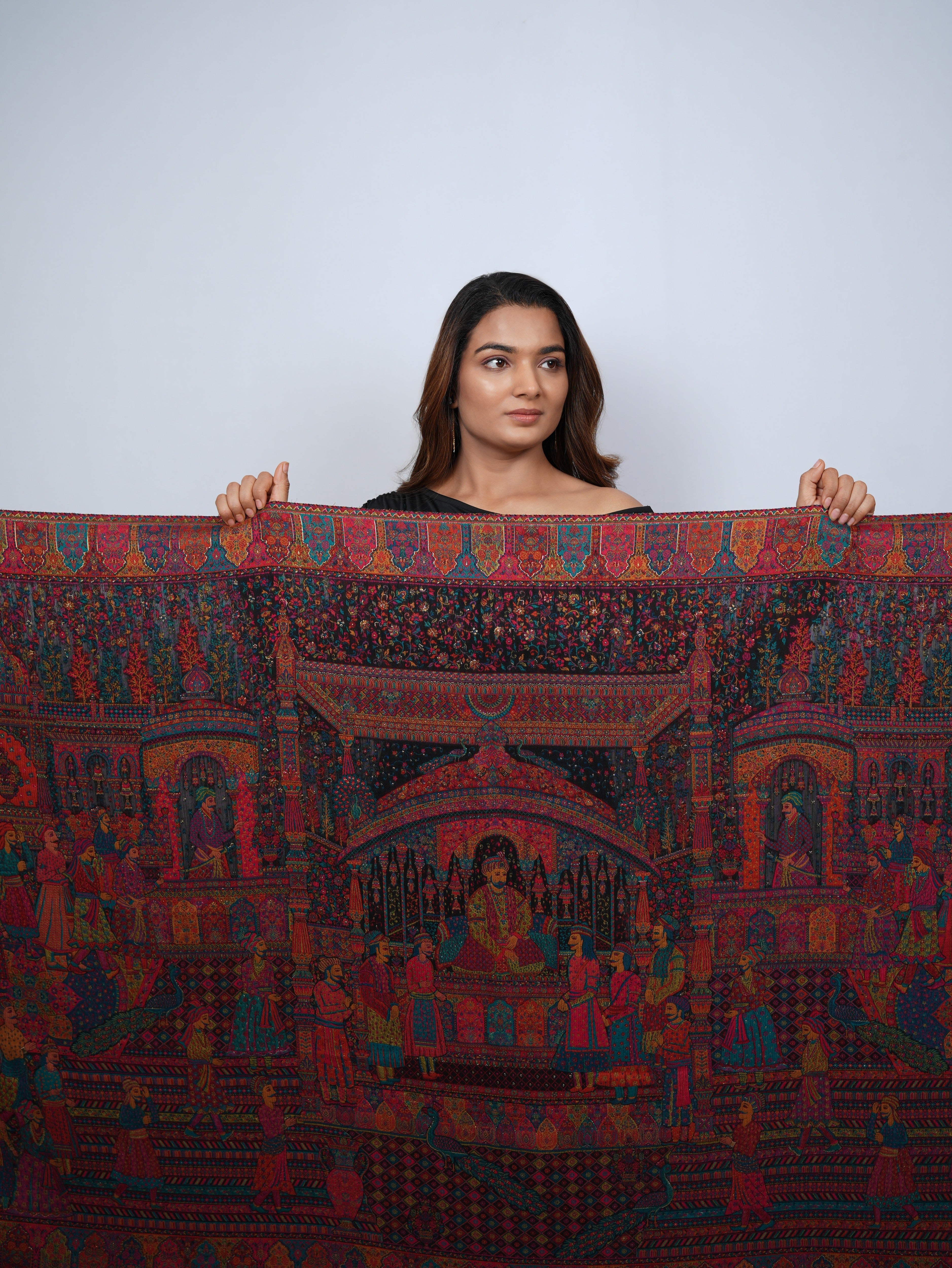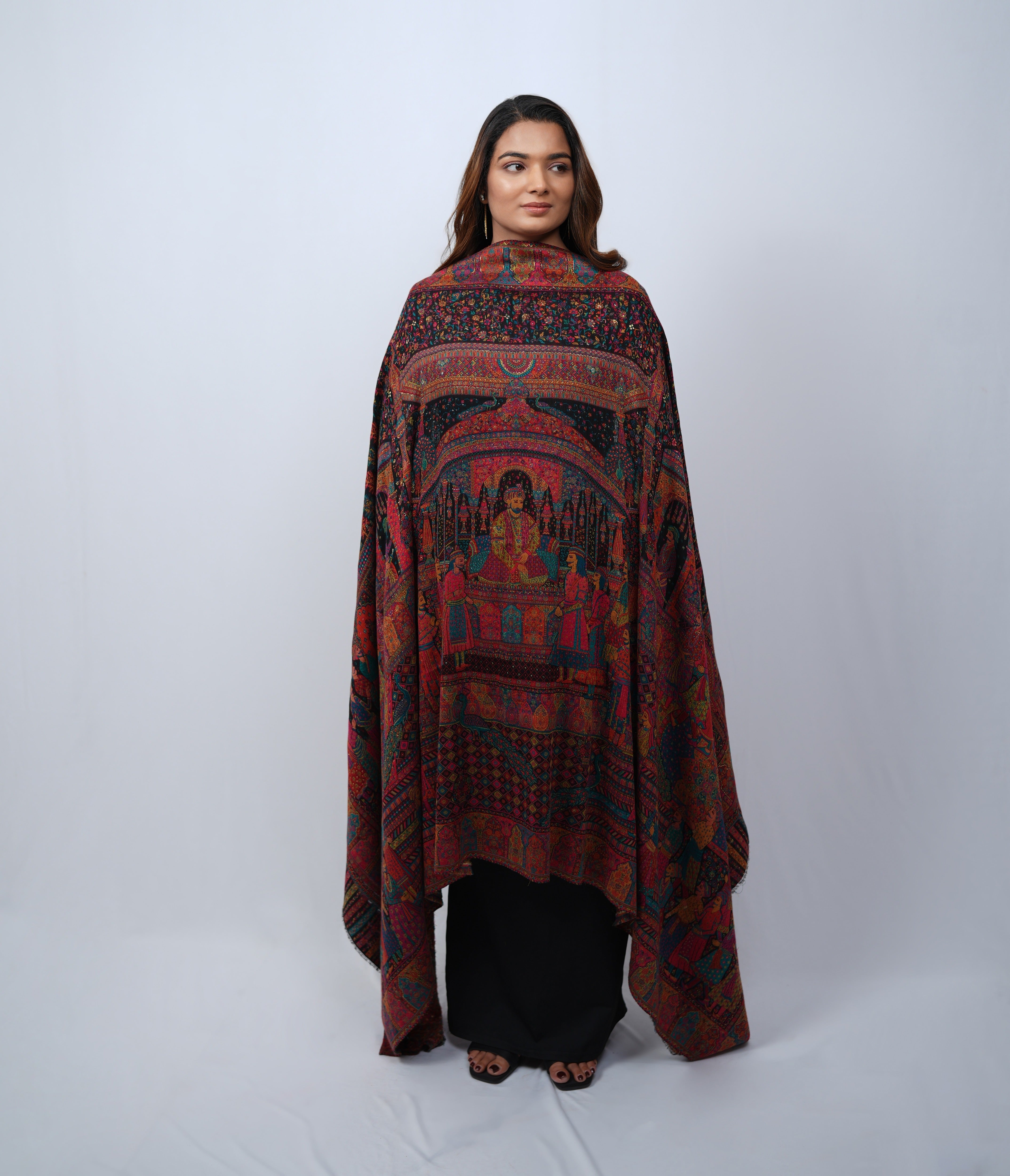 A statement pashmina wrap featuring intricate royal court scenes, designed as a timeless piece of wearable art.