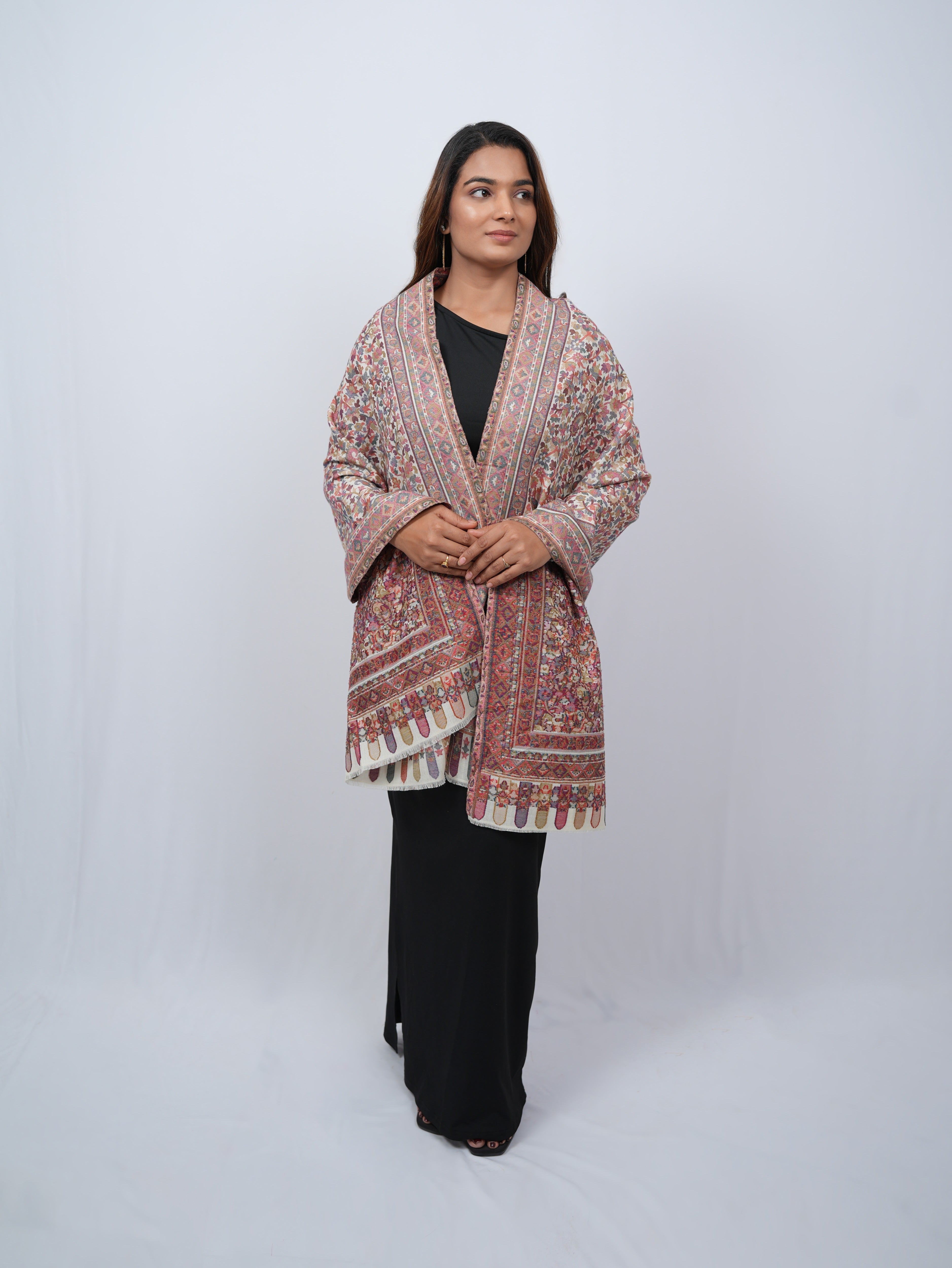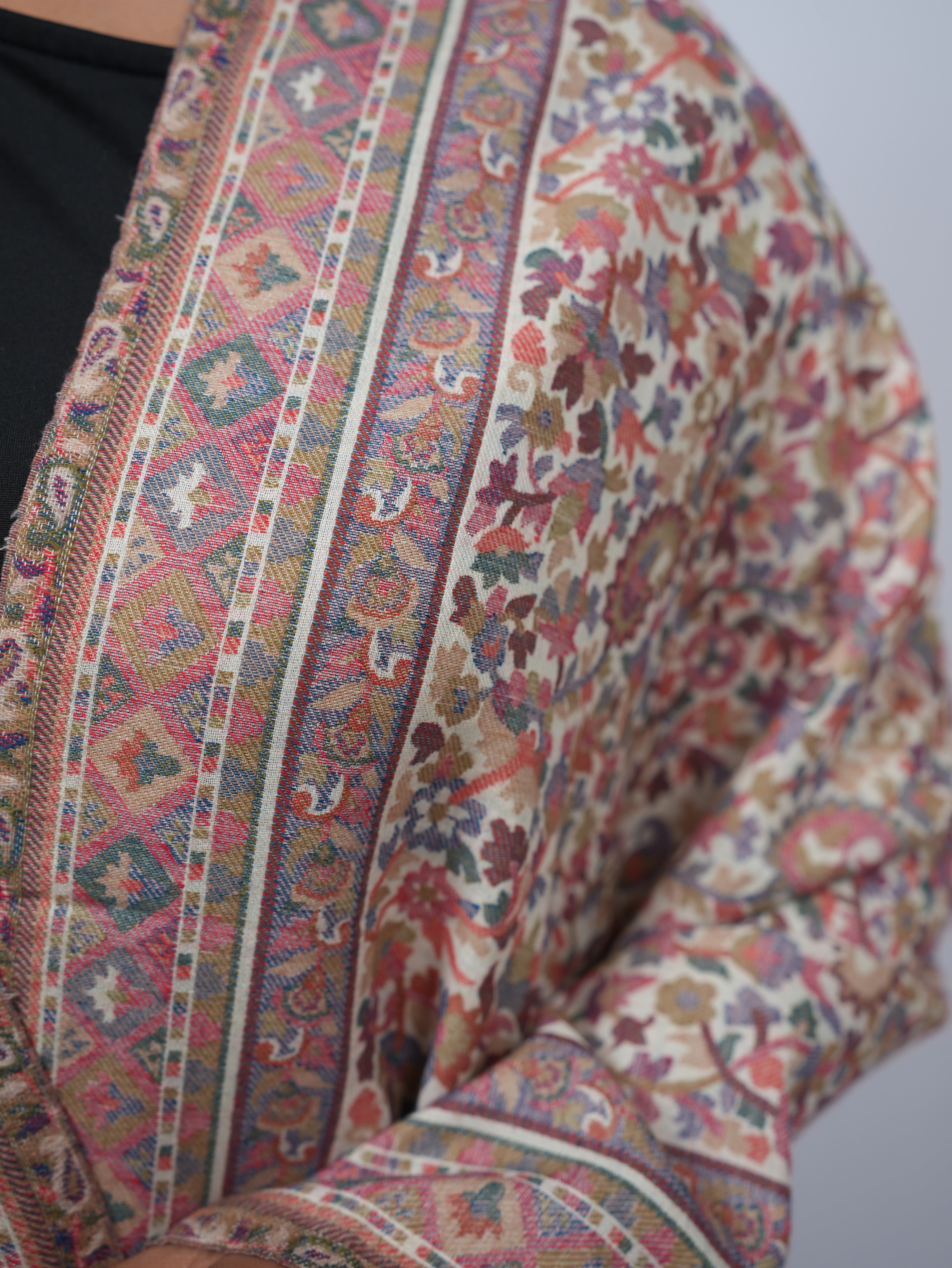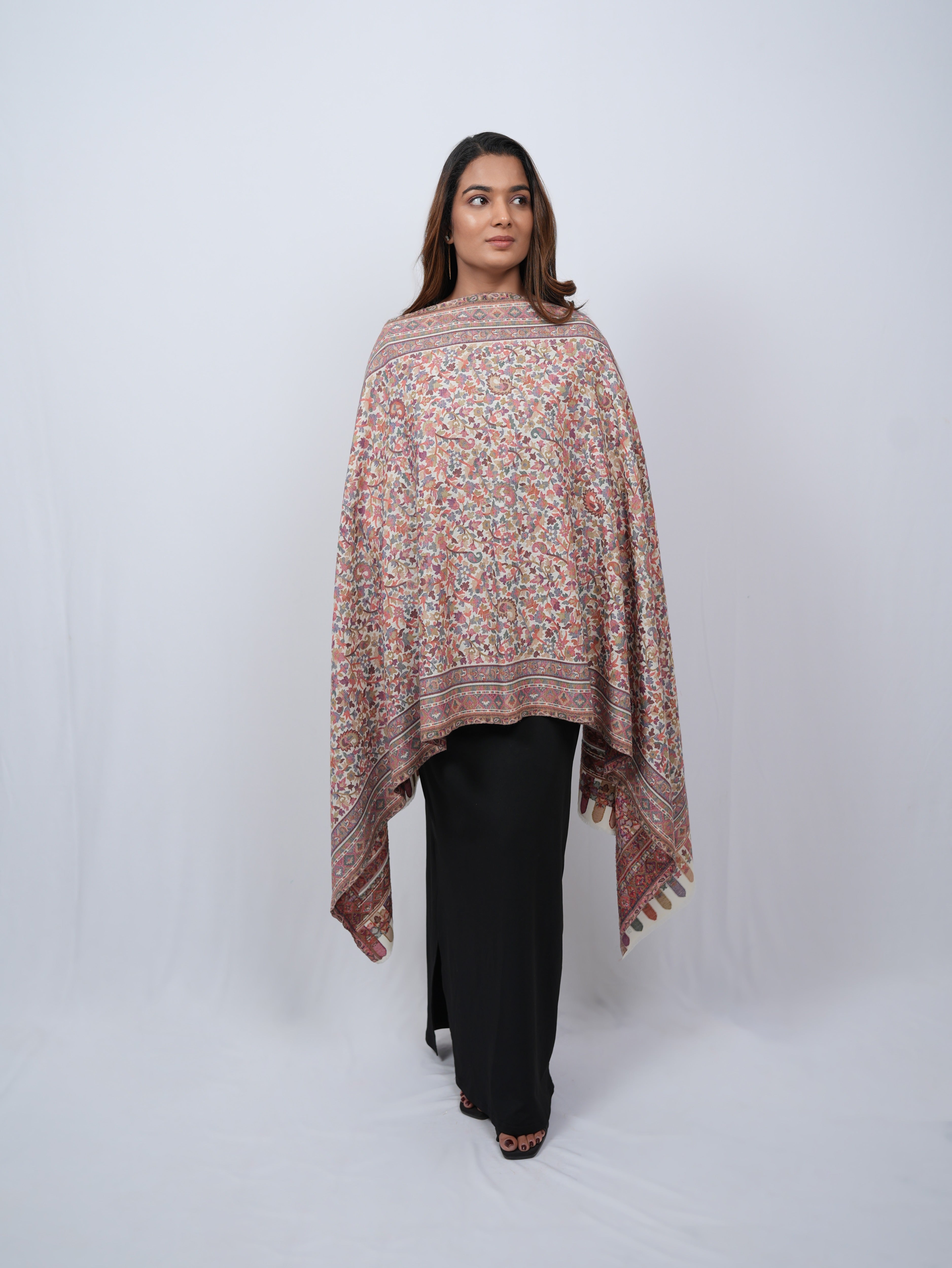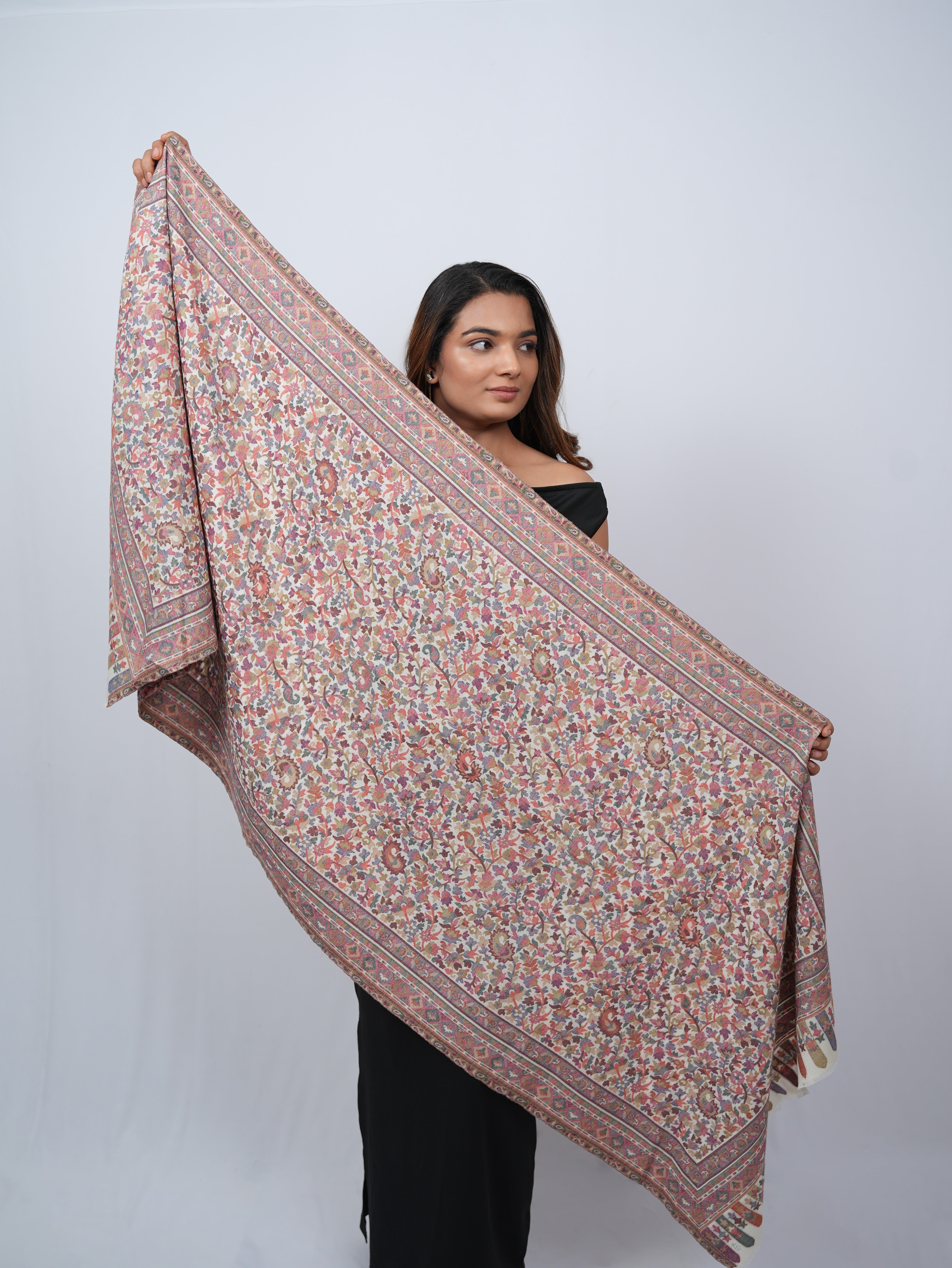 An intricately woven pashmina shawl featuring delicate vine and paisley motifs, finished with a richly patterned border for a timeless, heritage-inspired look.