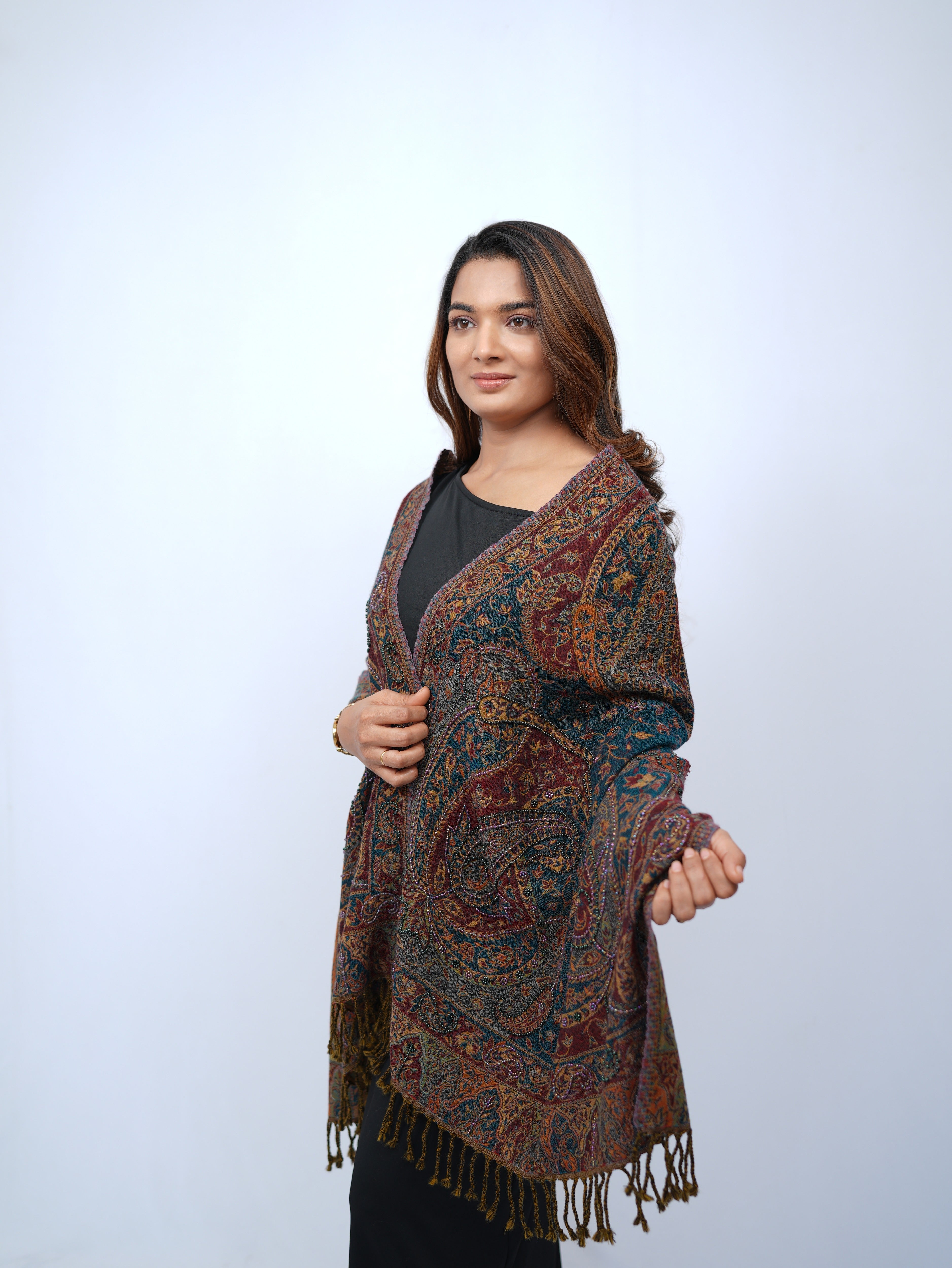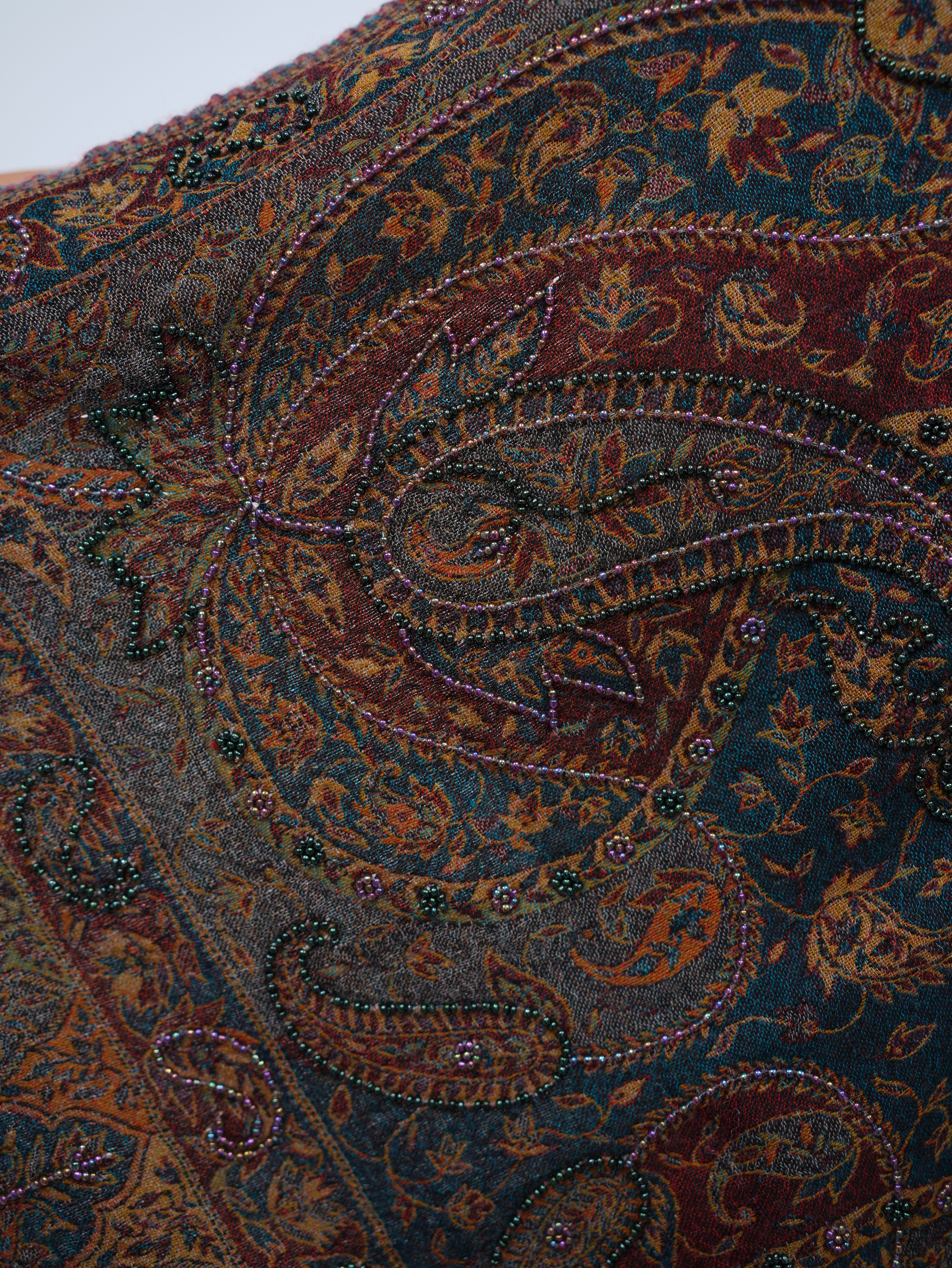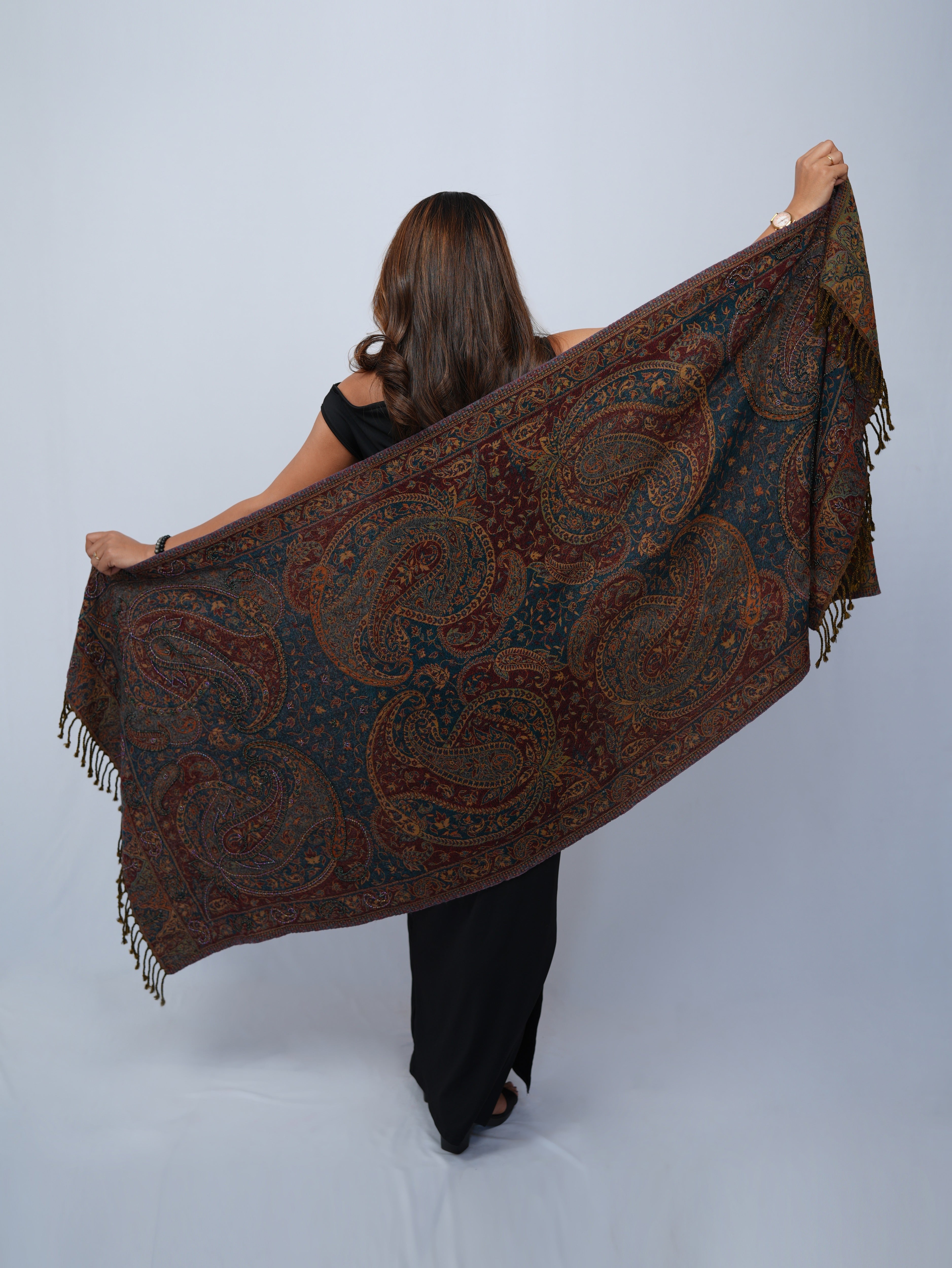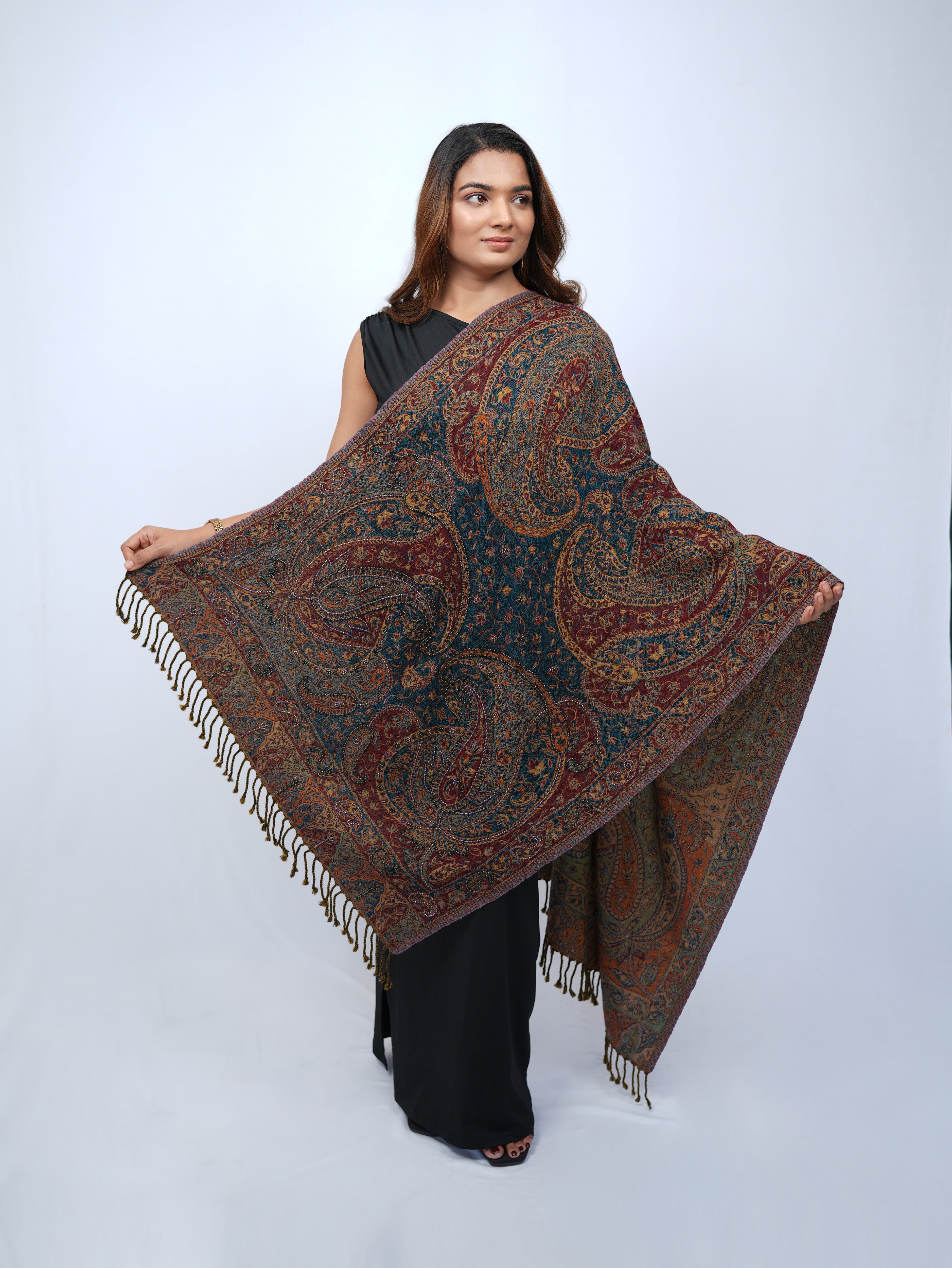 A richly detailed wool wrap featuring intricate paisley motifs and floral vines, adorn with embroidery crafted for timeless sophistication.