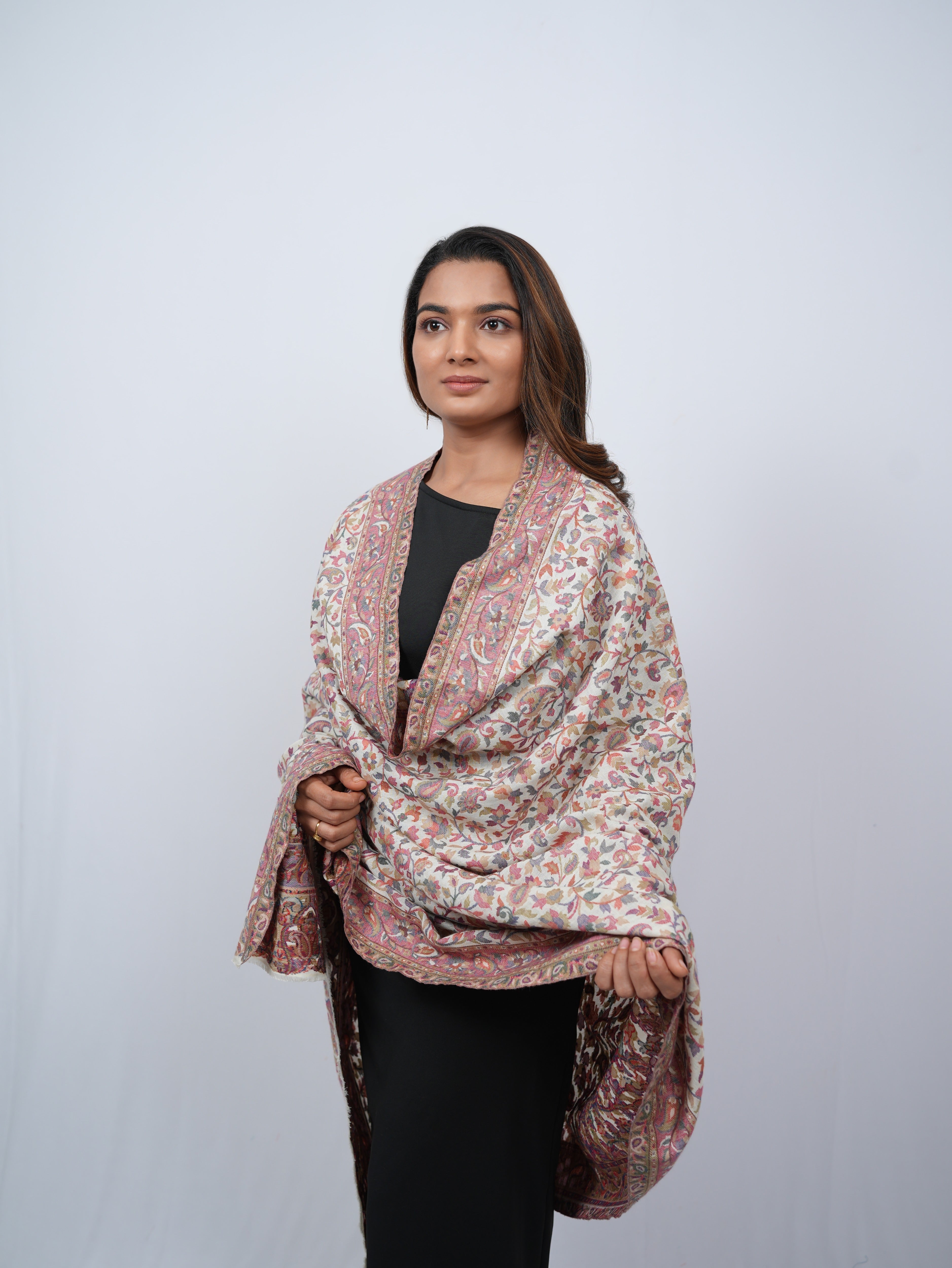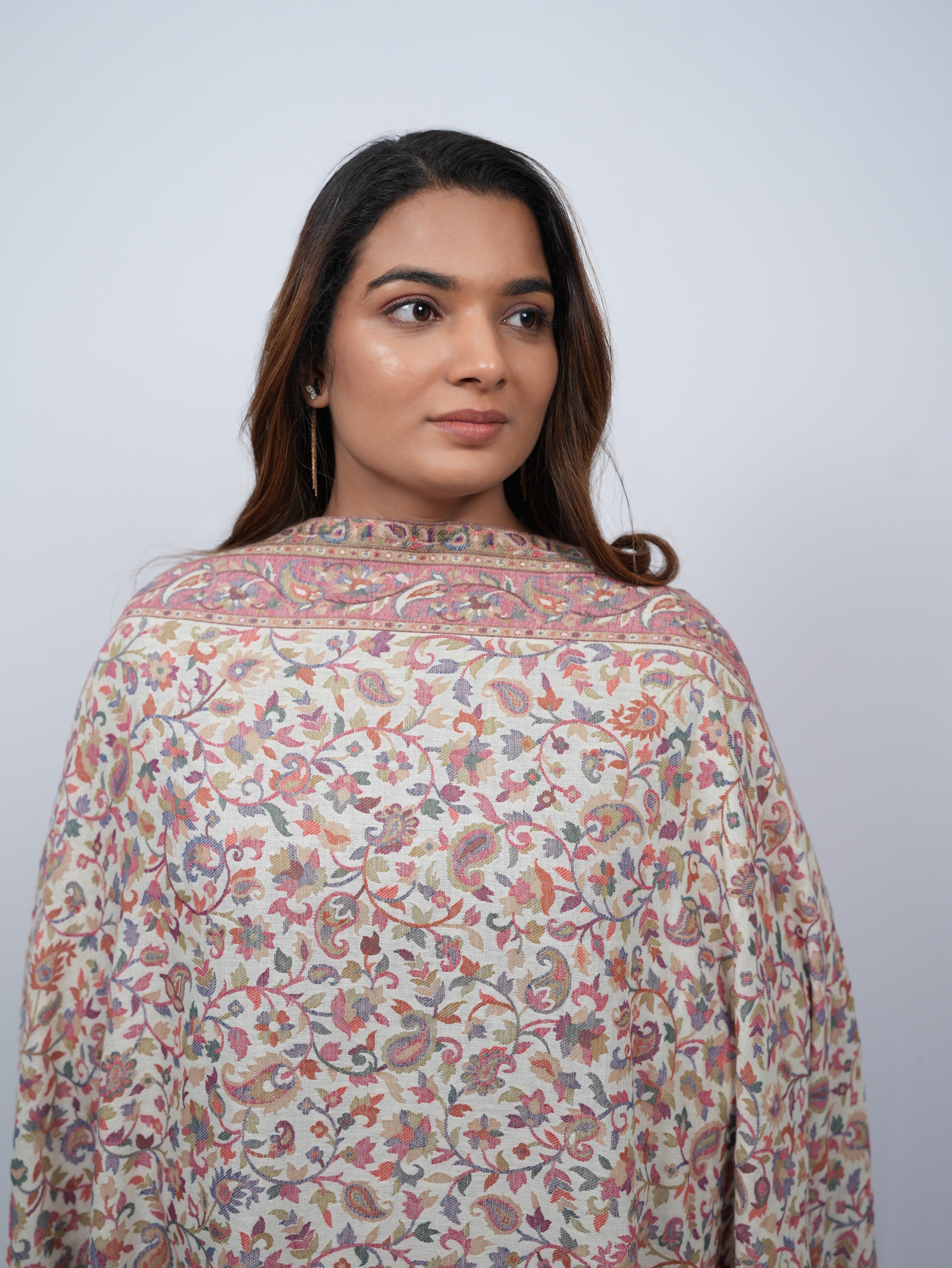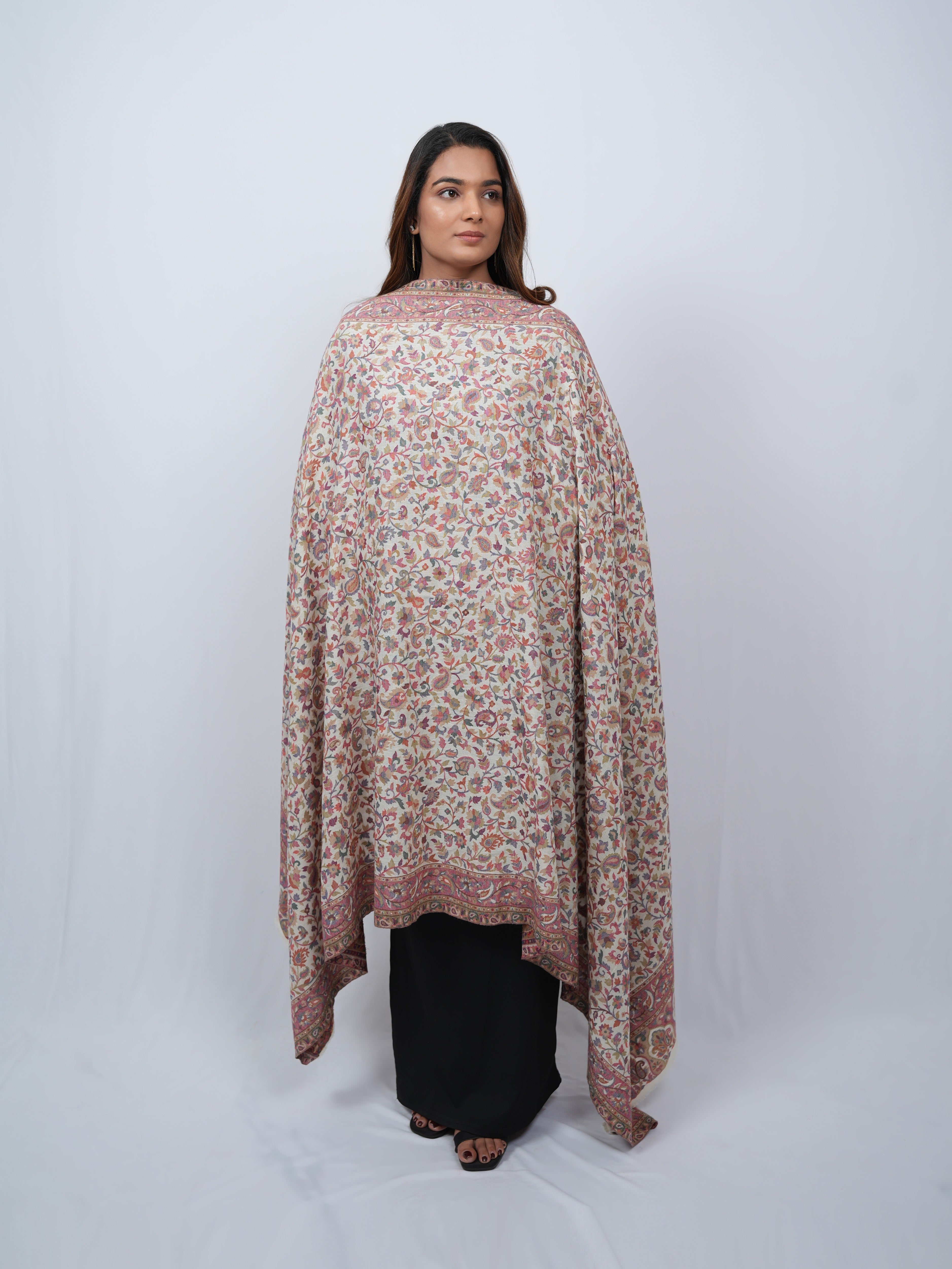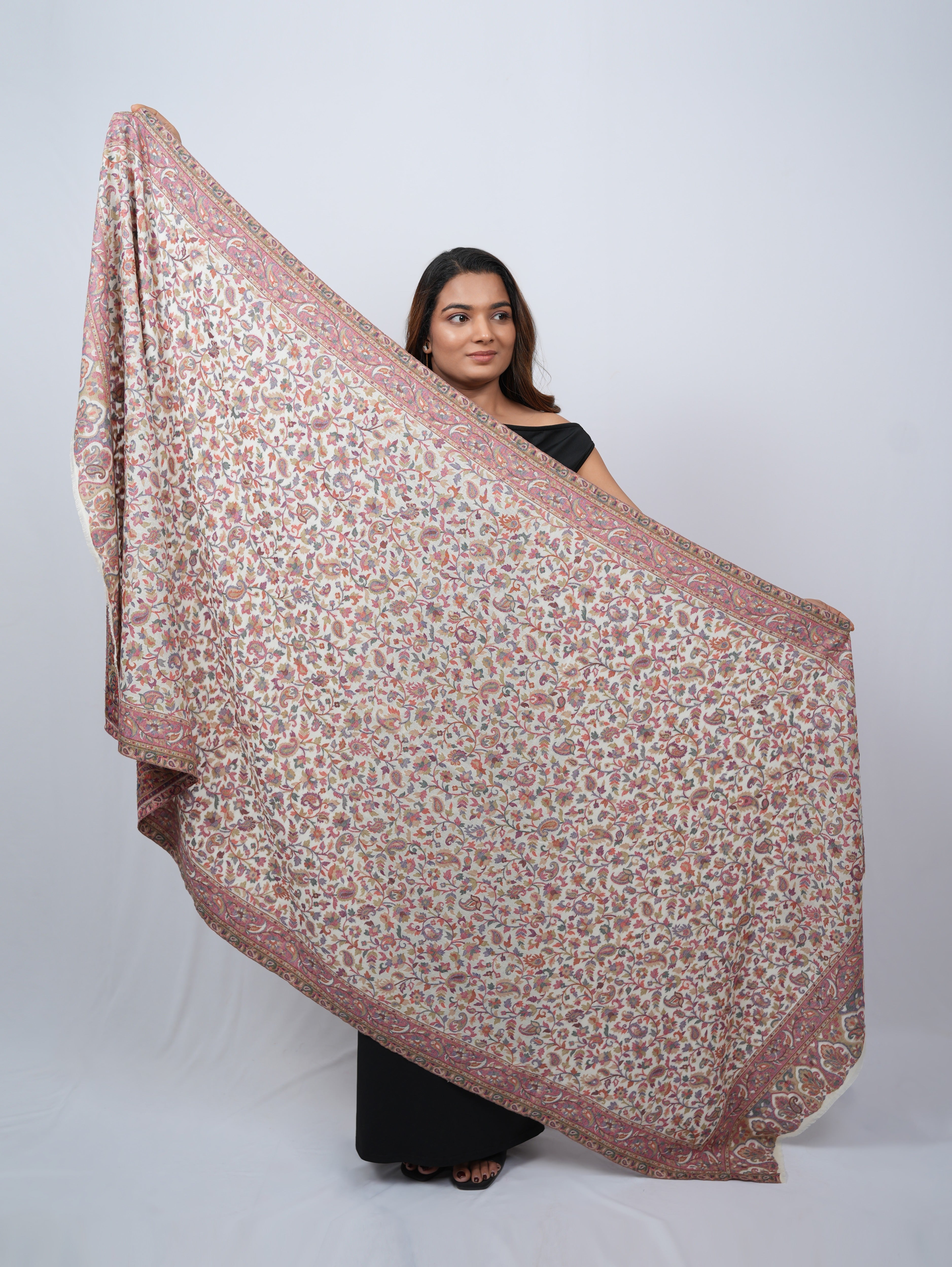 A graceful ivory pashmina shawl adorned with delicate floral vines and subtle paisley accents, finished with an ornate, heritage-inspired border.