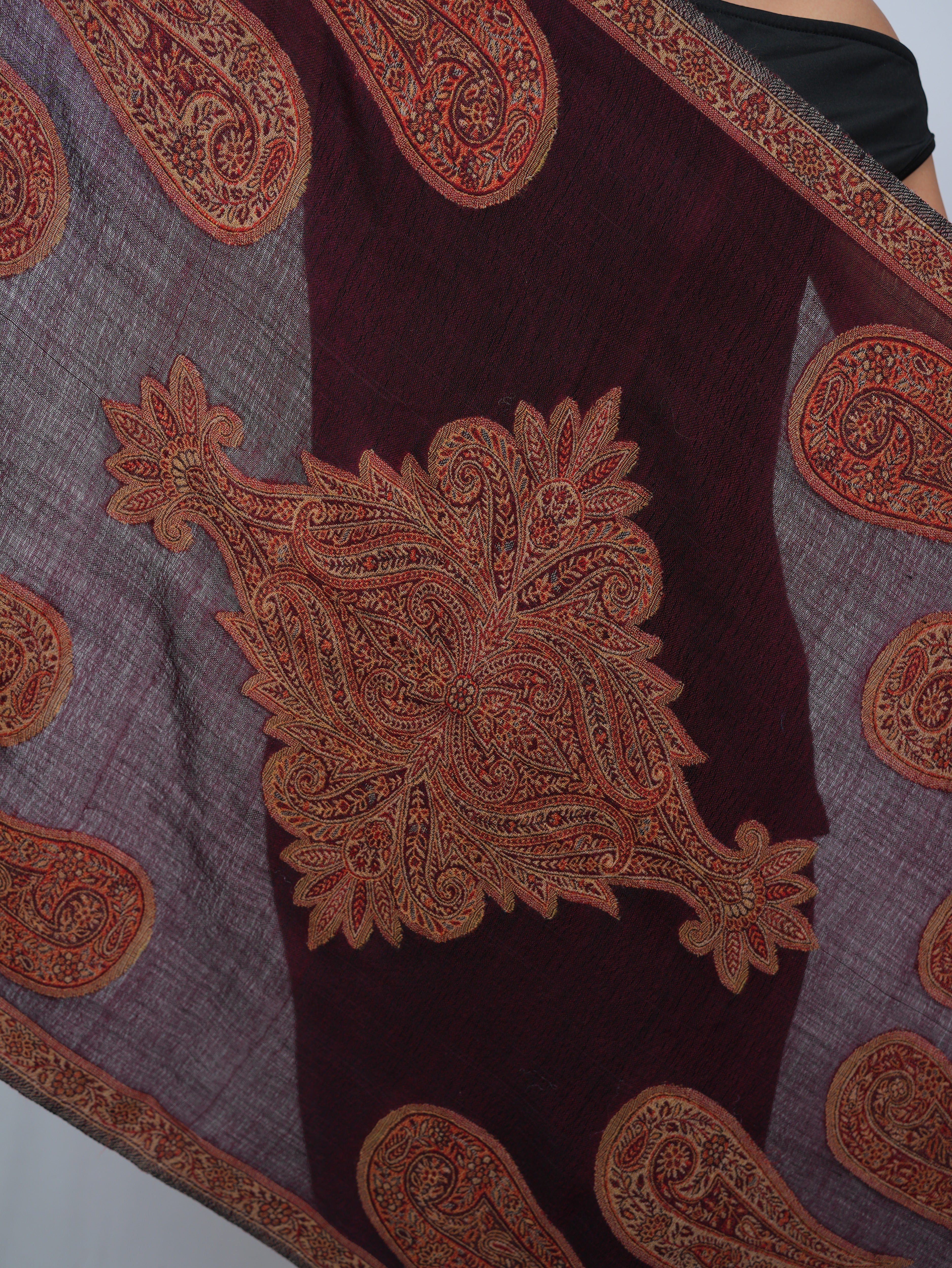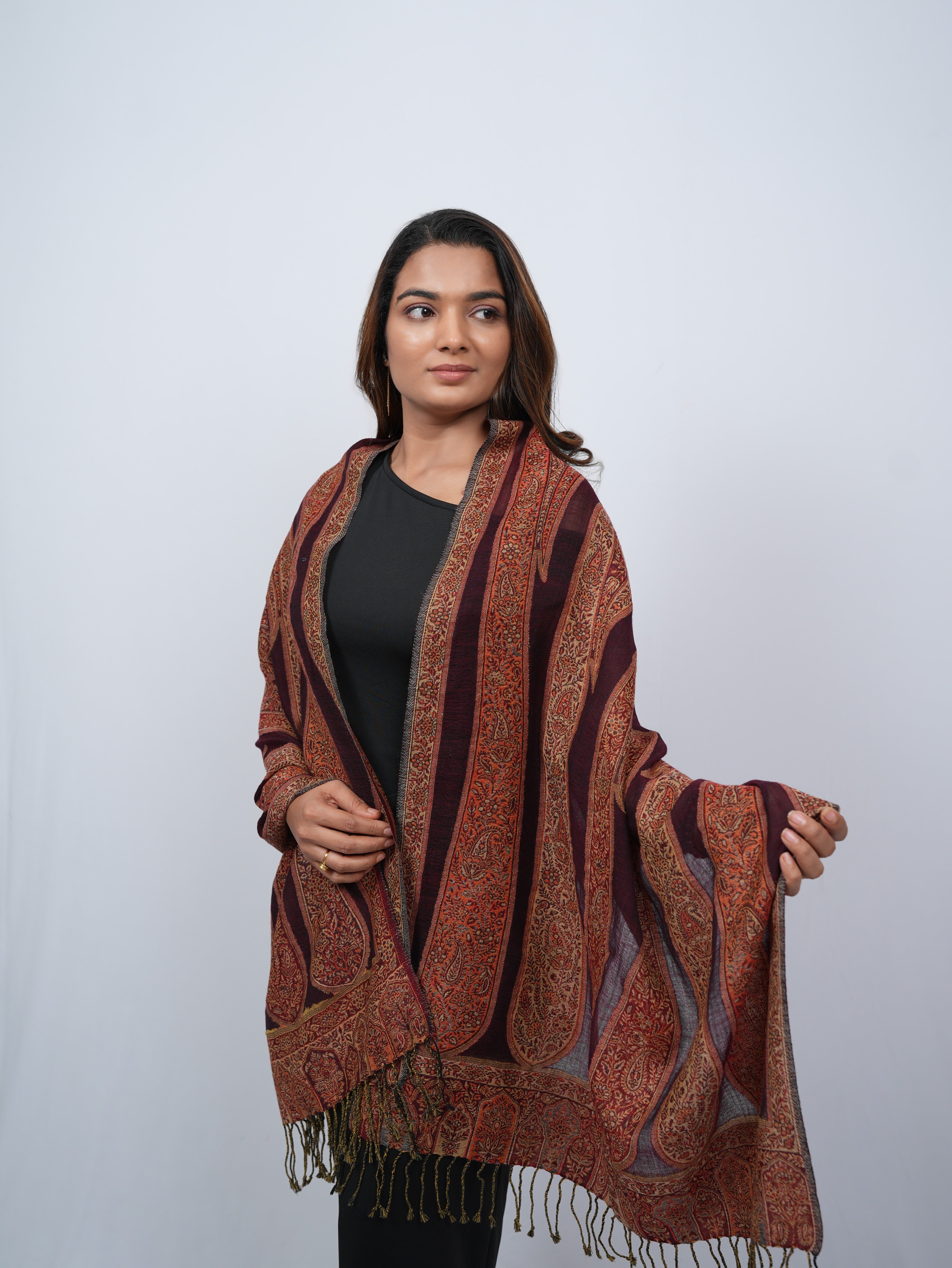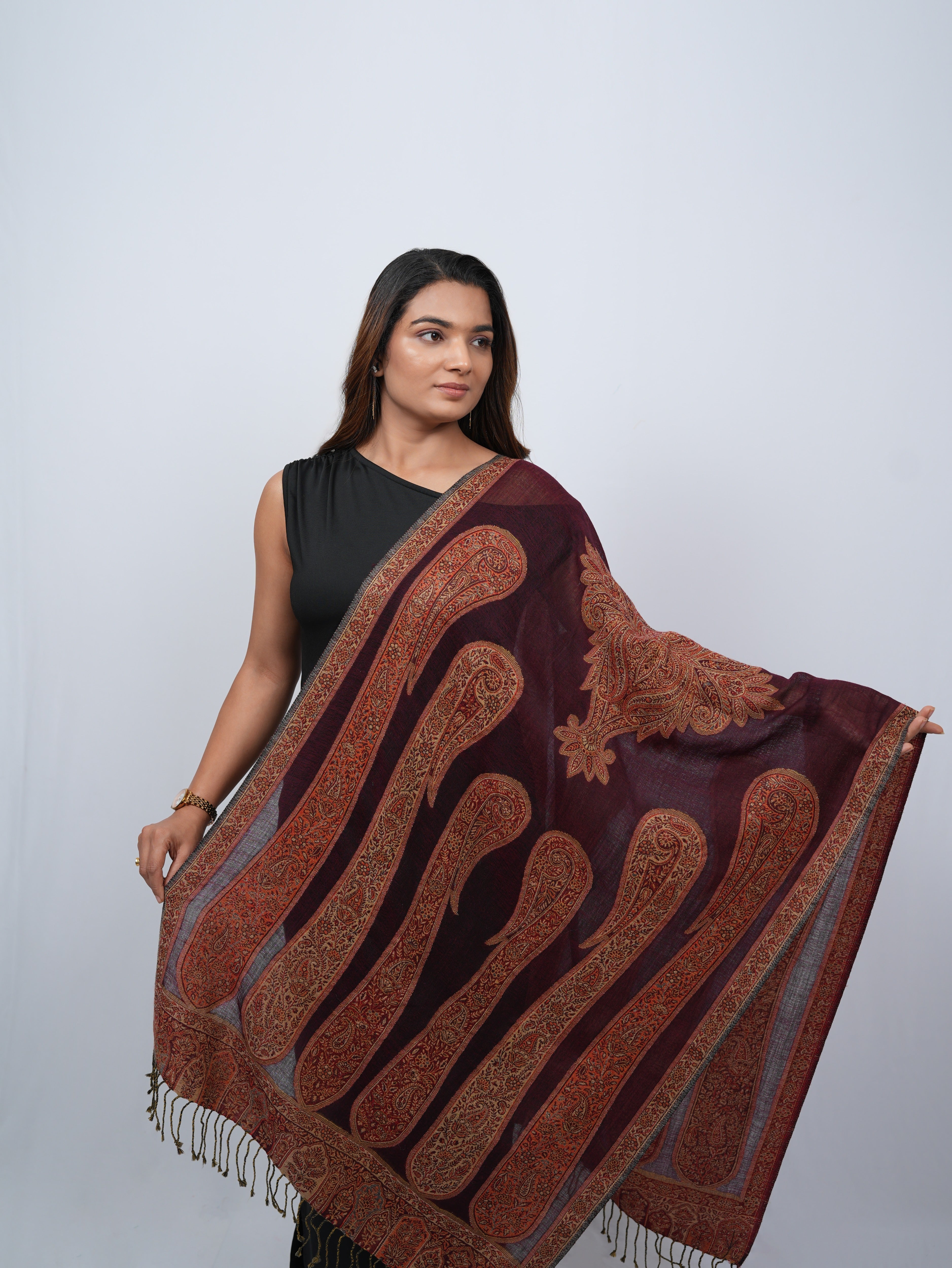 A rich pashmina wrap featuring elongated paisley motifs on a deep midnight base, designed for timeless elegance and refined statement.