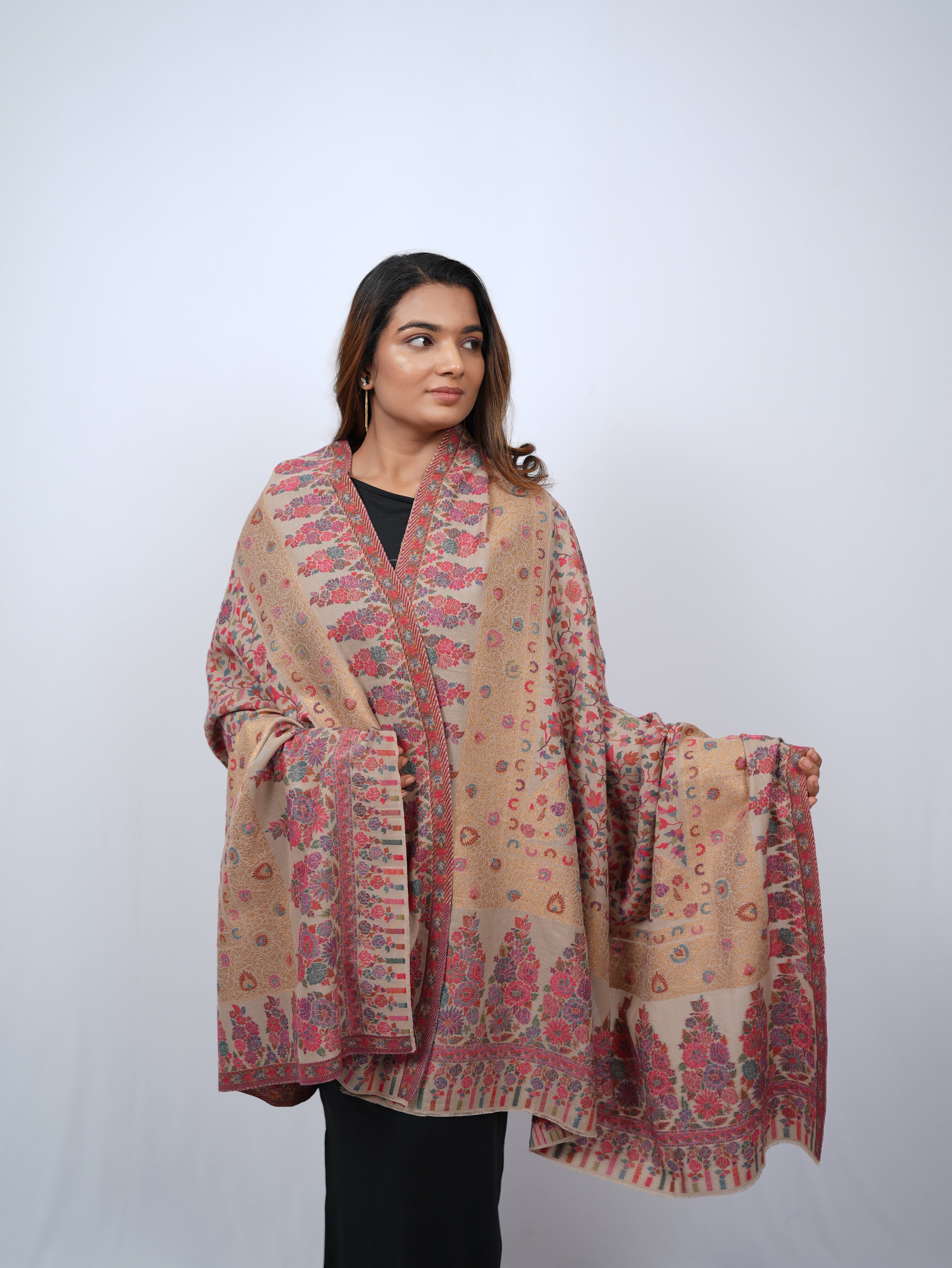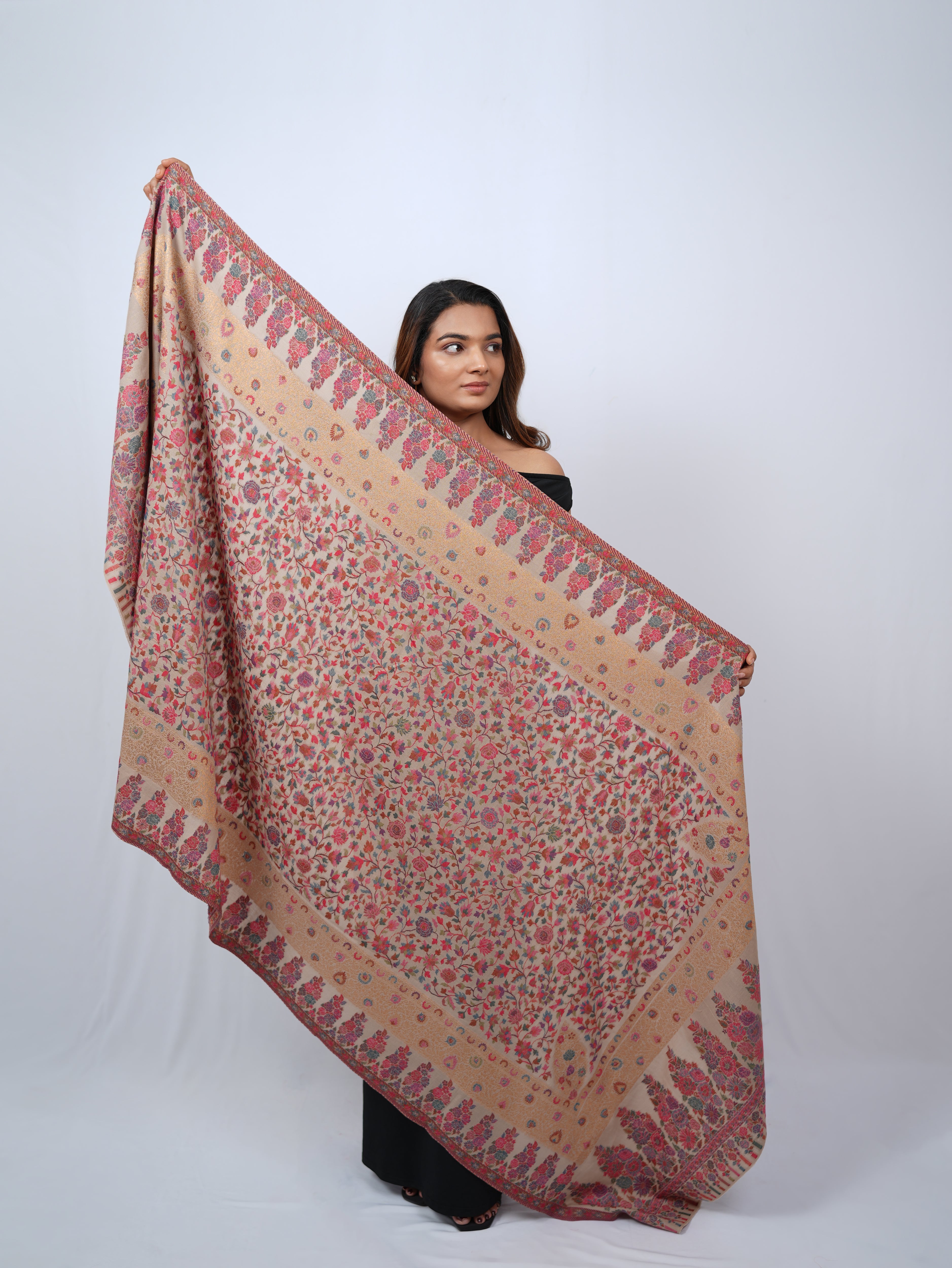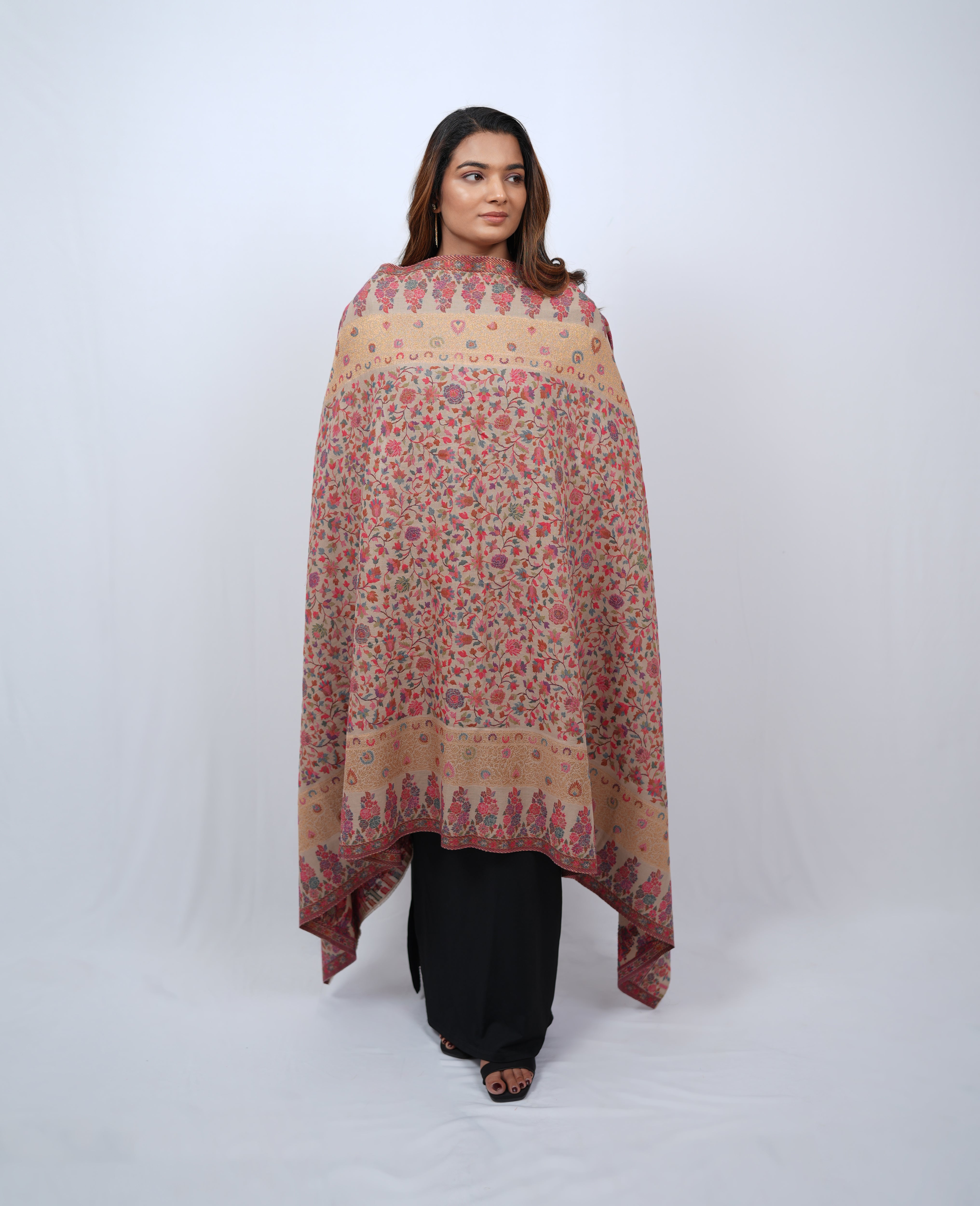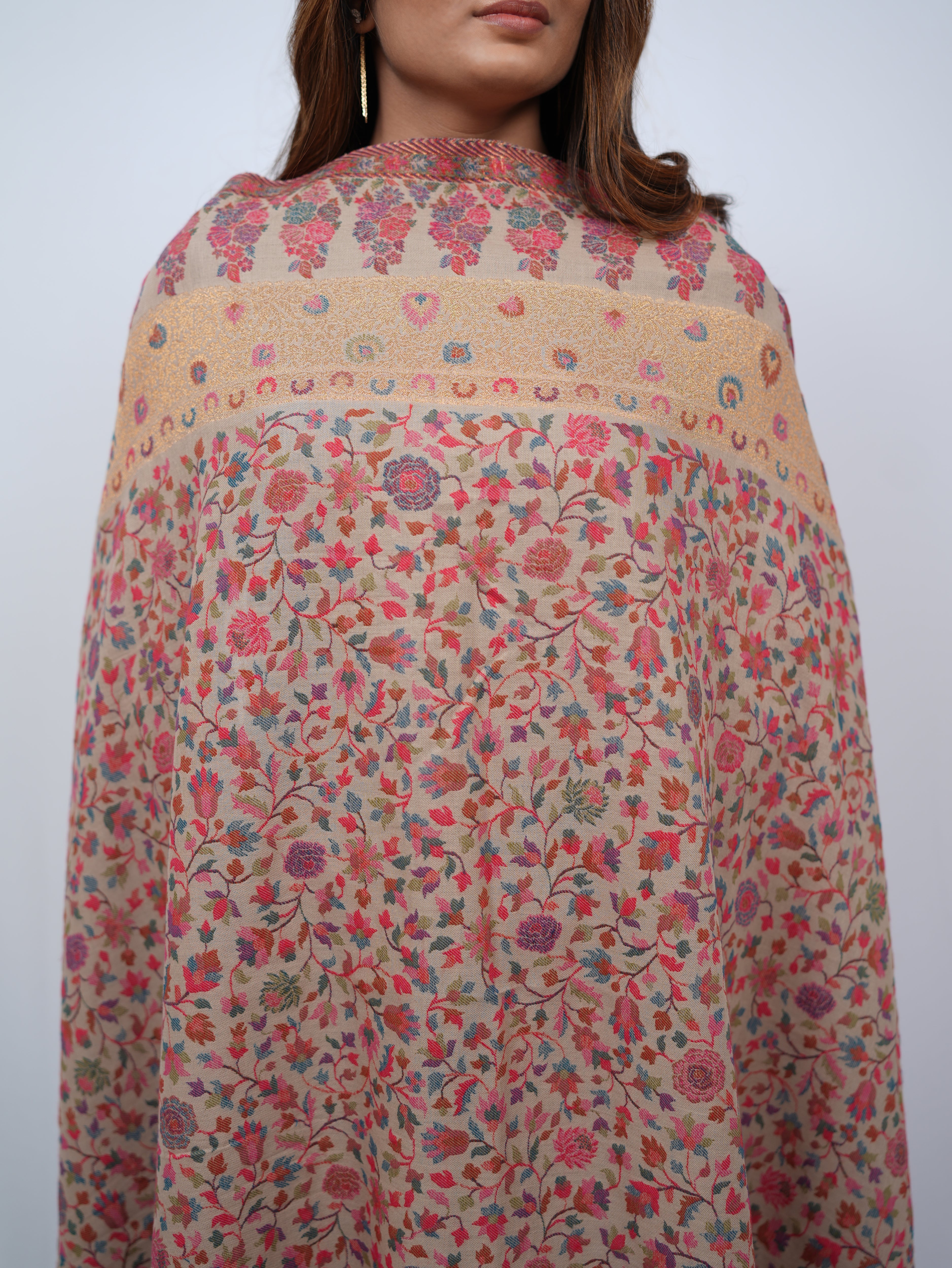 A delicate pashmina wrap adorned with soft floral motifs and subtle gold detailing, designed for effortless elegance.