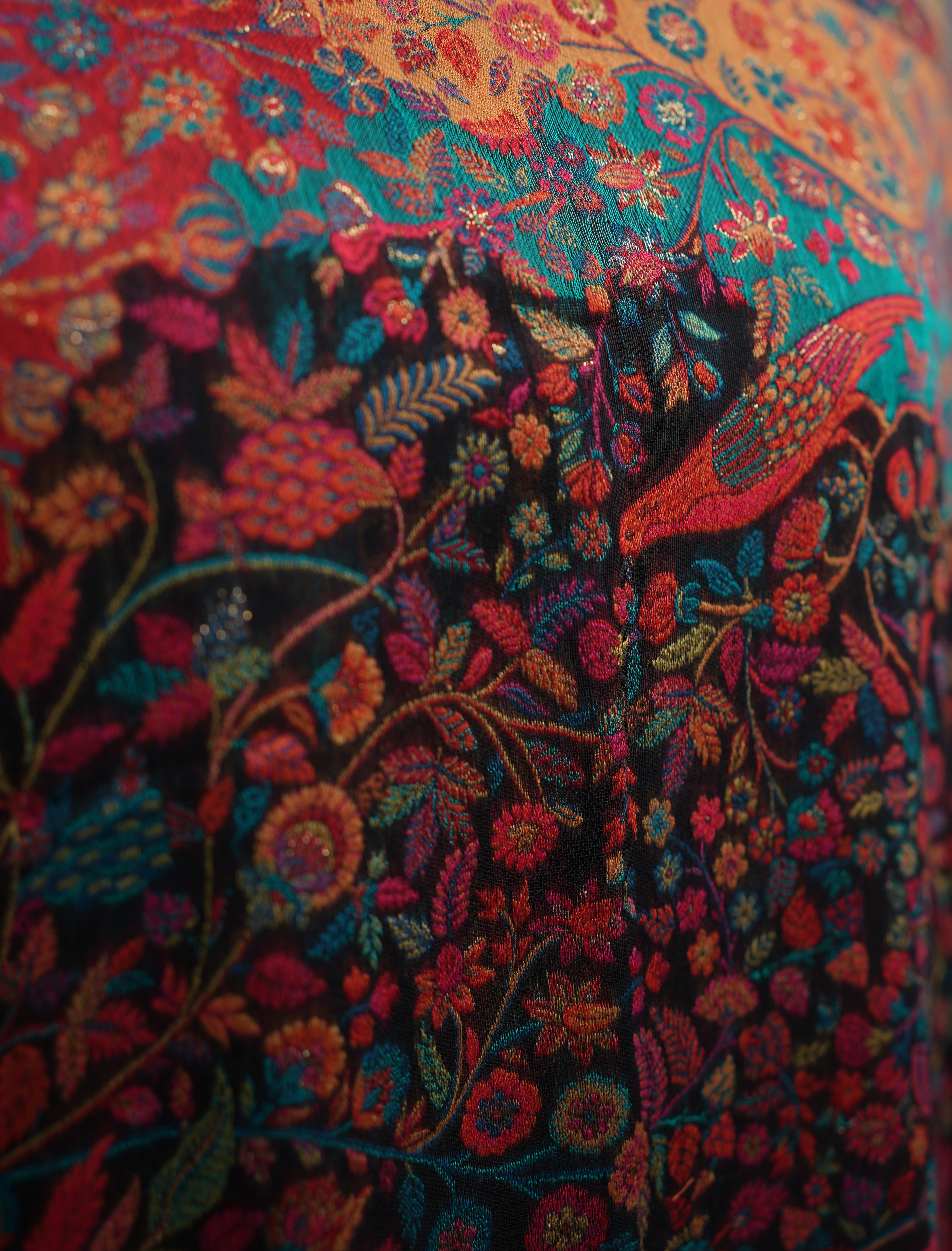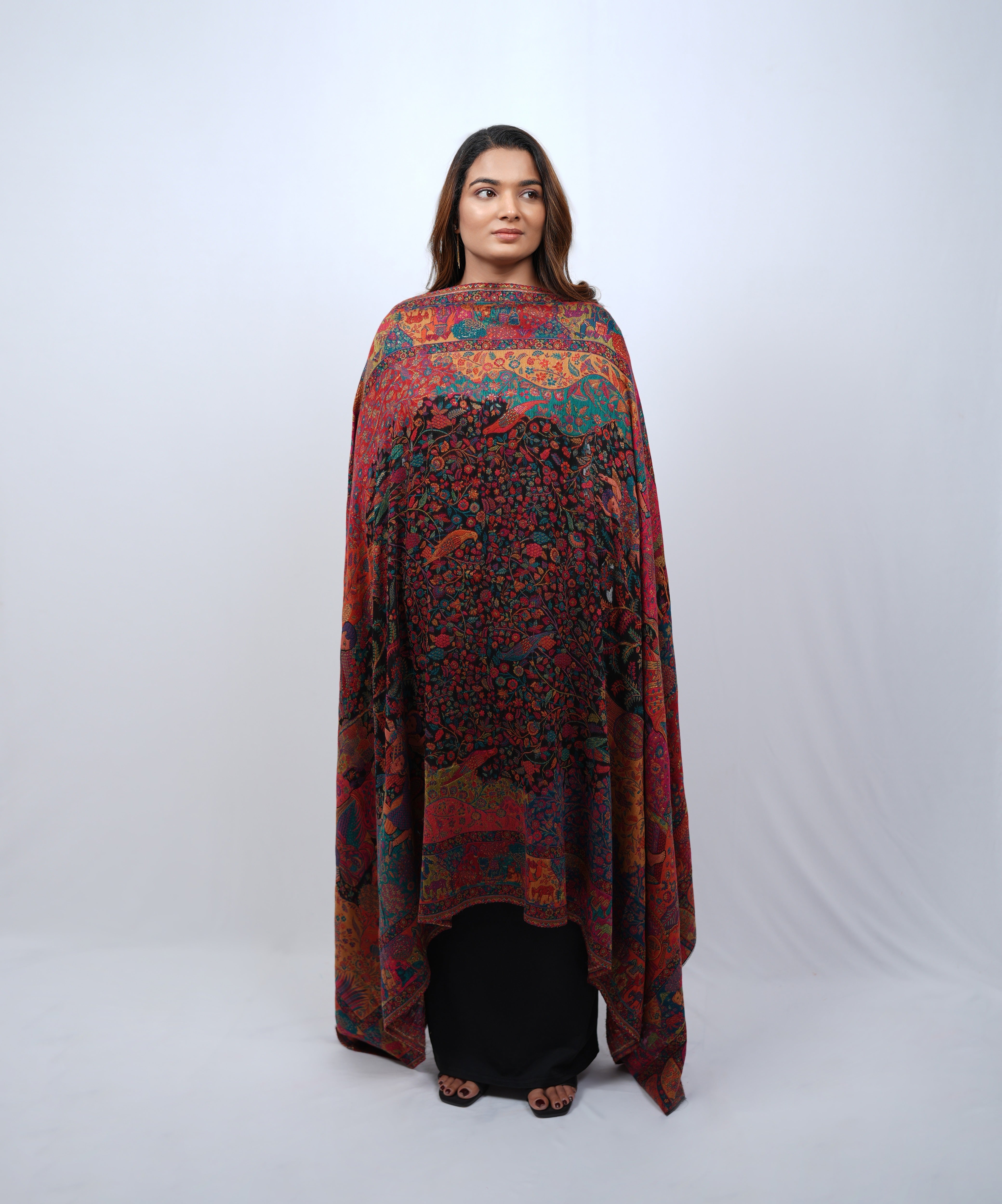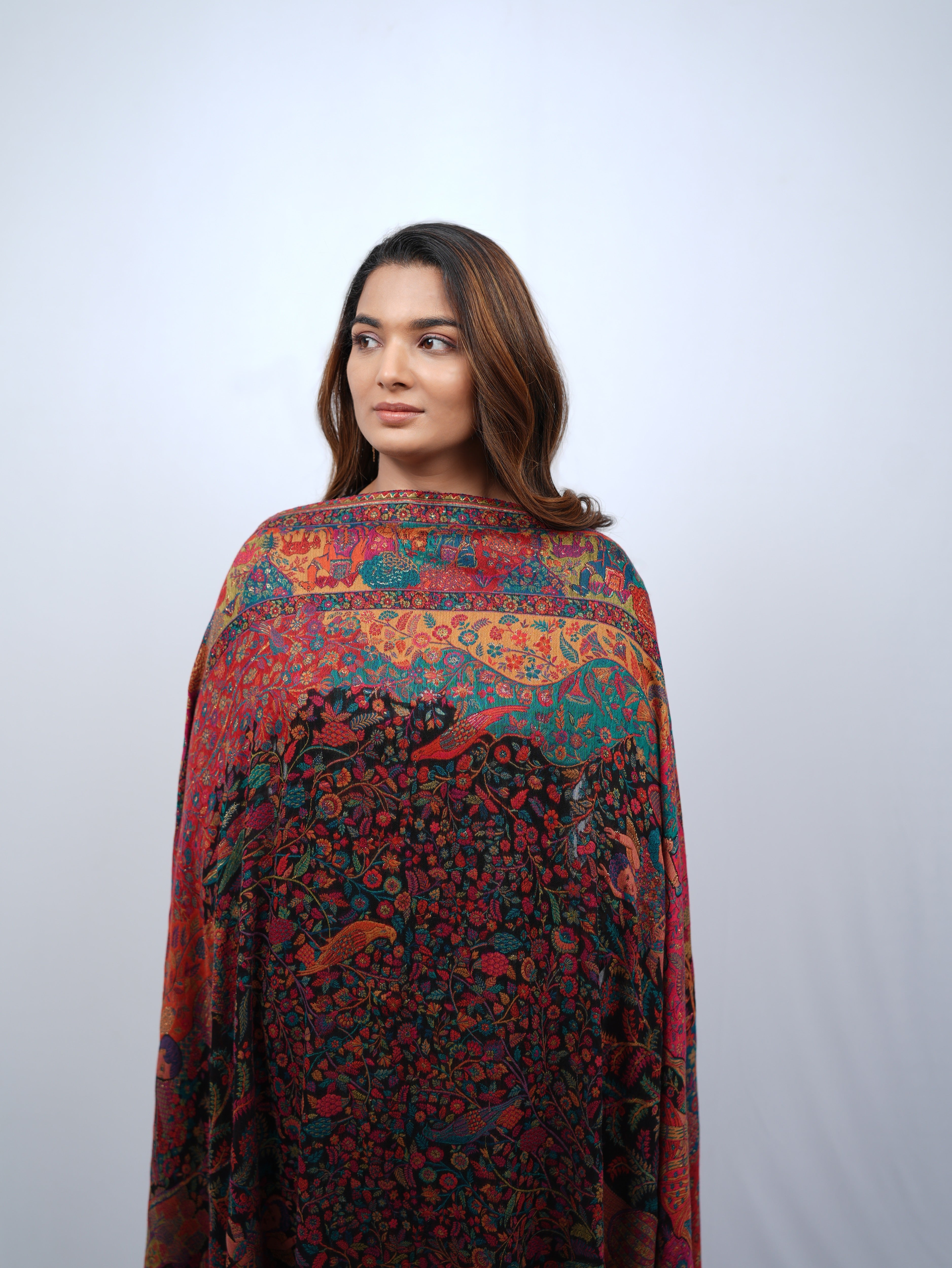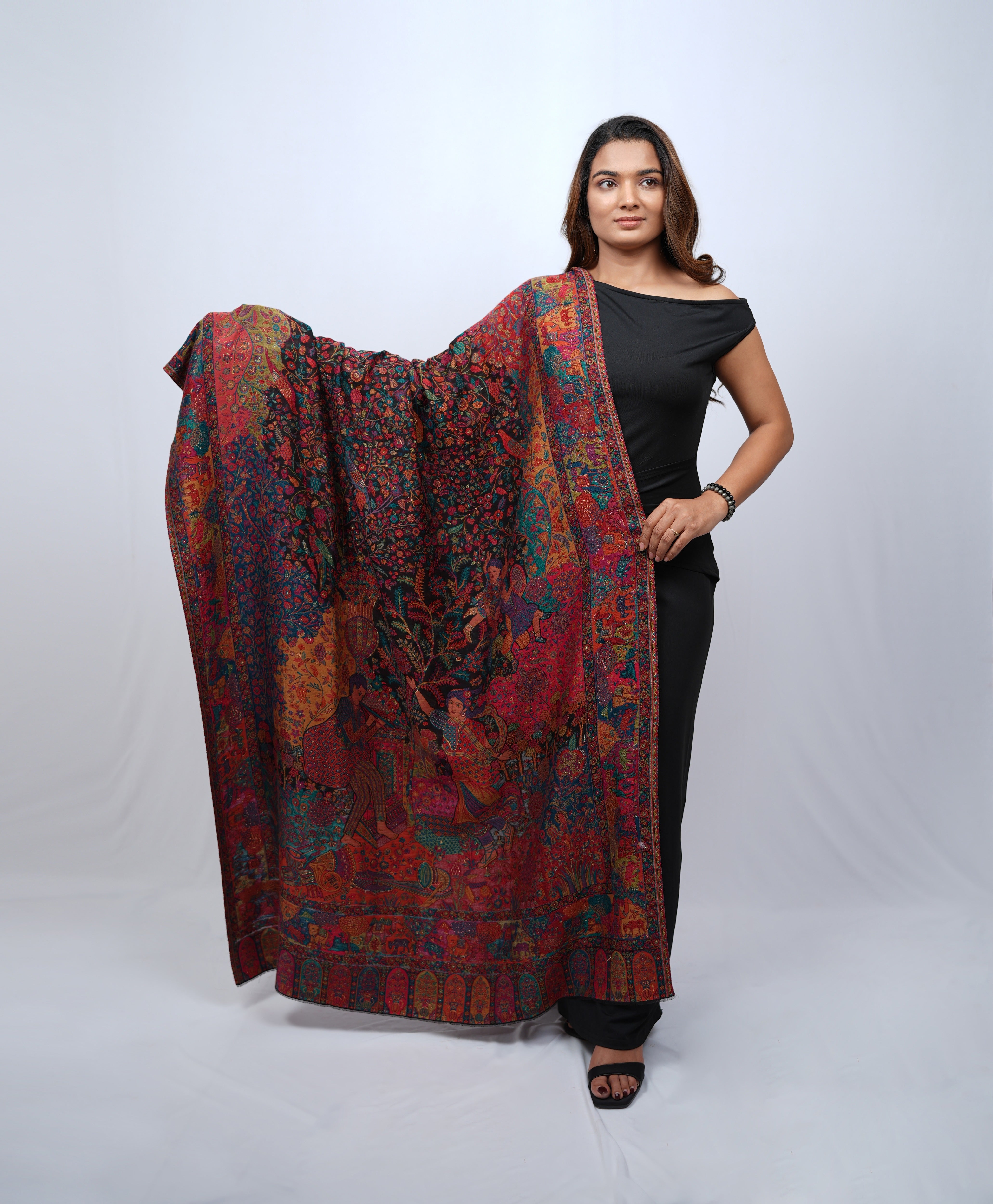 A vibrant pashmina shawl brought to life with intricate scenes of music, movement, and florals designed as a statement of artistic elegance.
